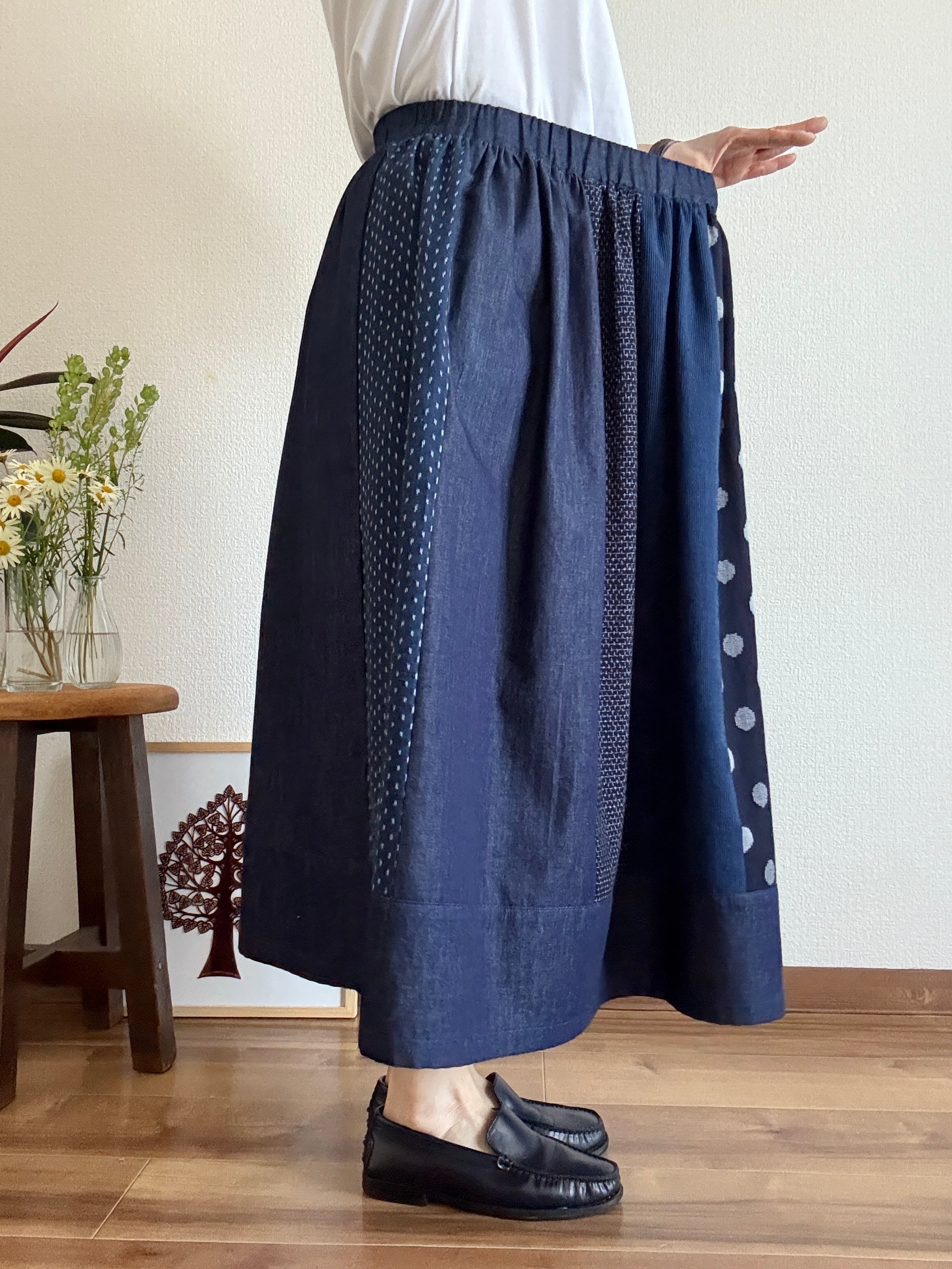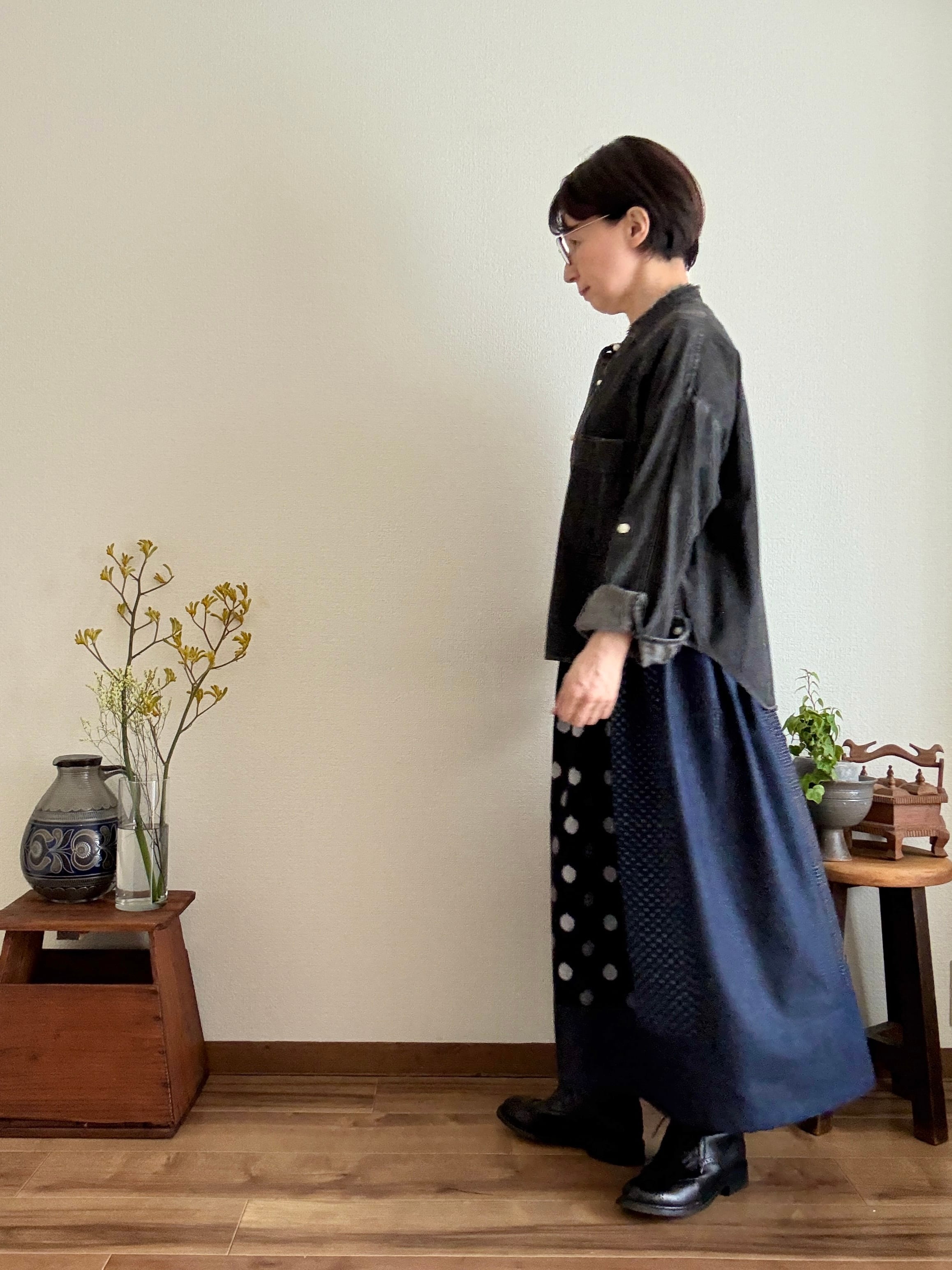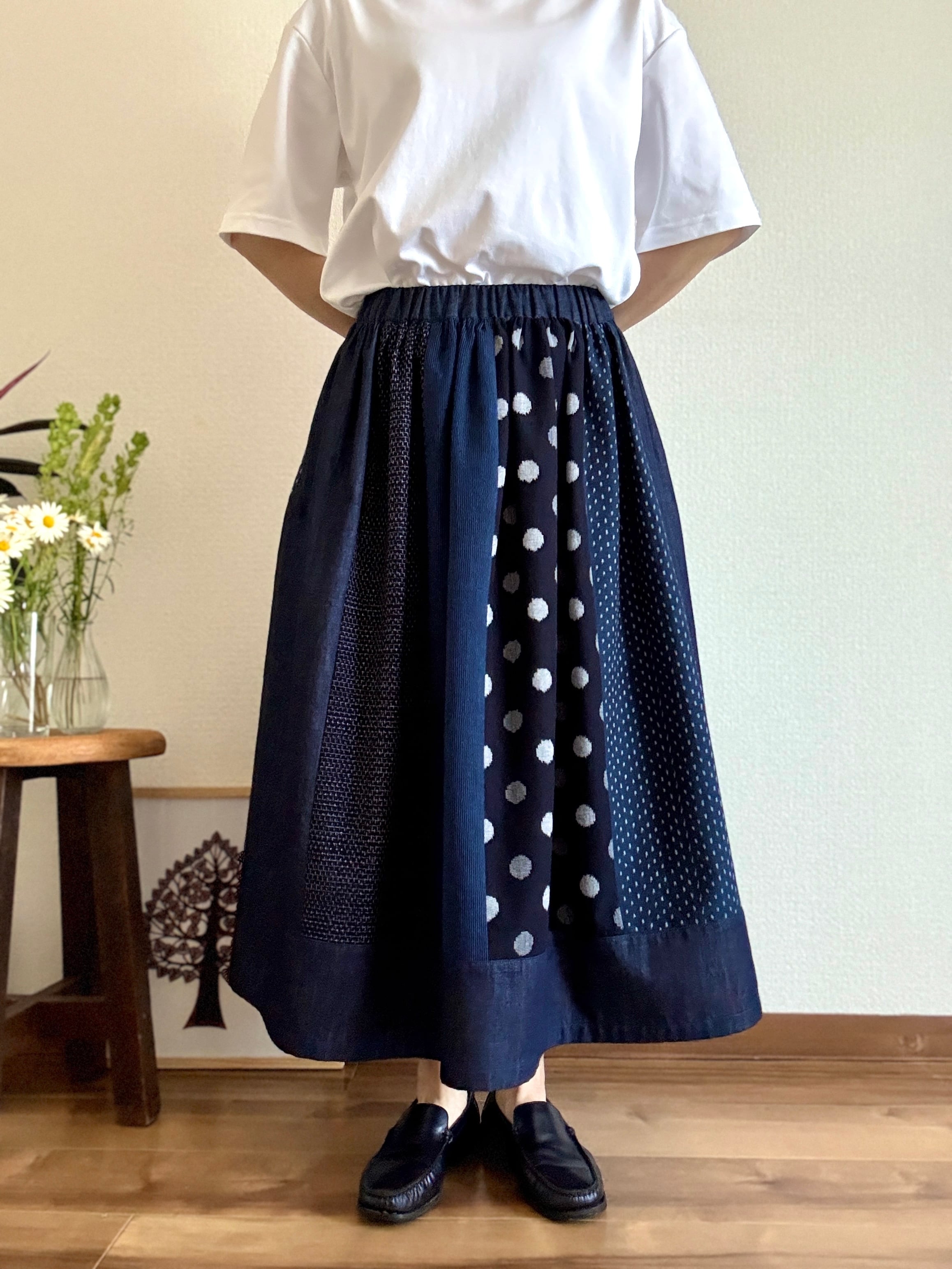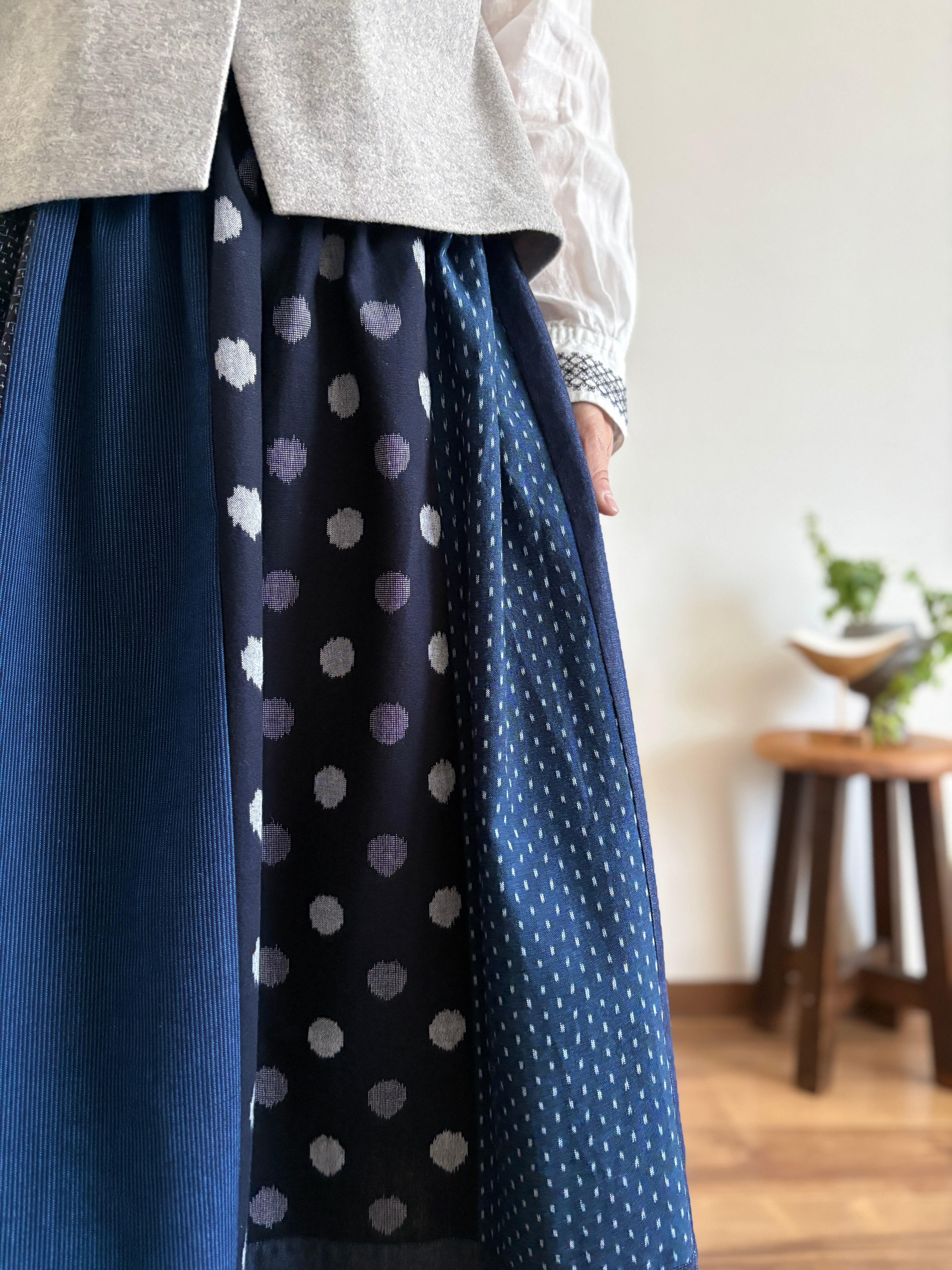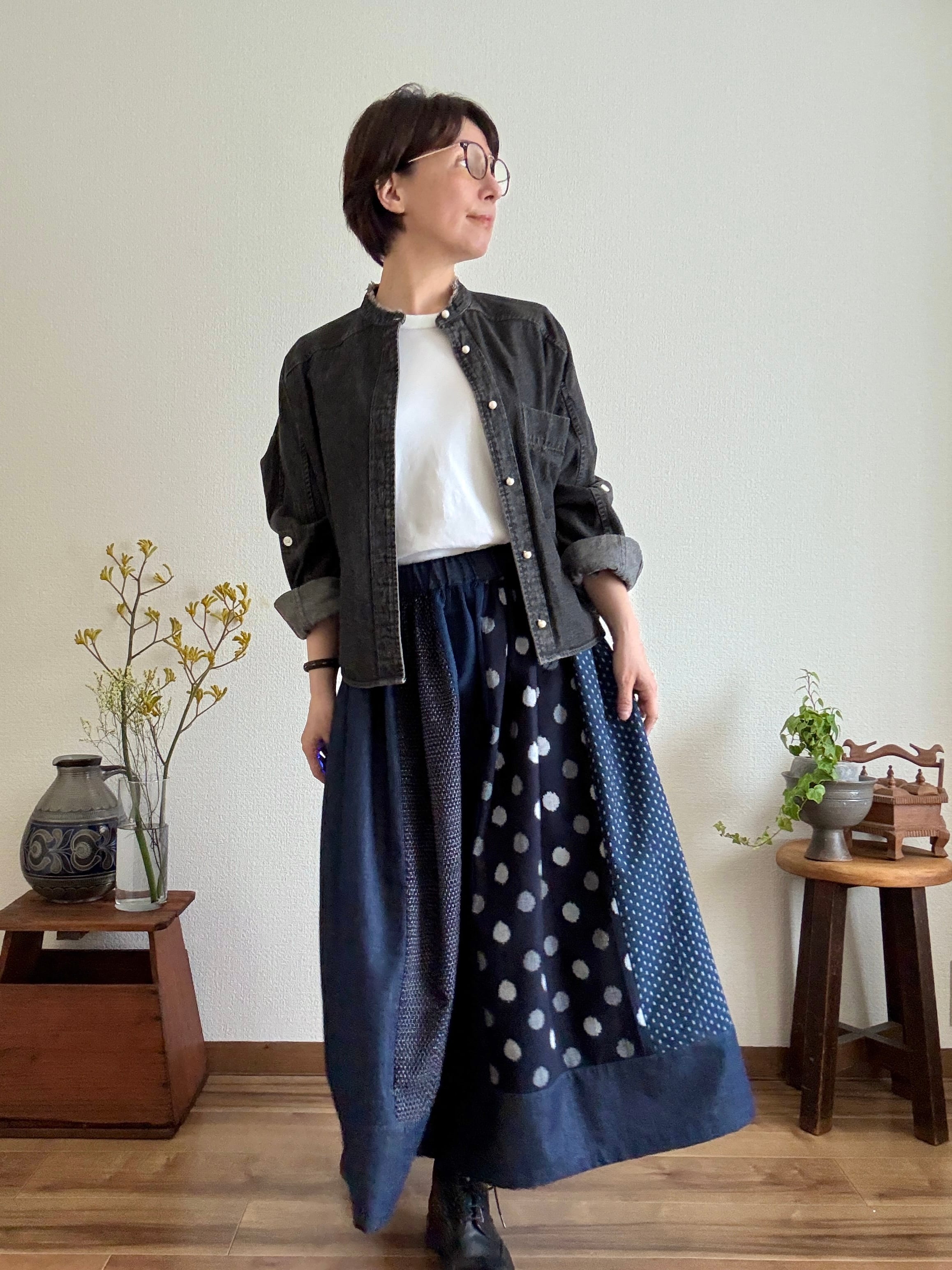 「久留米絣」の新反物と「児島デニム」2つの素材を掛け合わせたスカートは、職人さんたちの技術と情熱が詰まった特別な一枚です。手作業だからこそ生まれる温かみ、そして大量生産では決して味わえない魅力をぜひ感じてください。