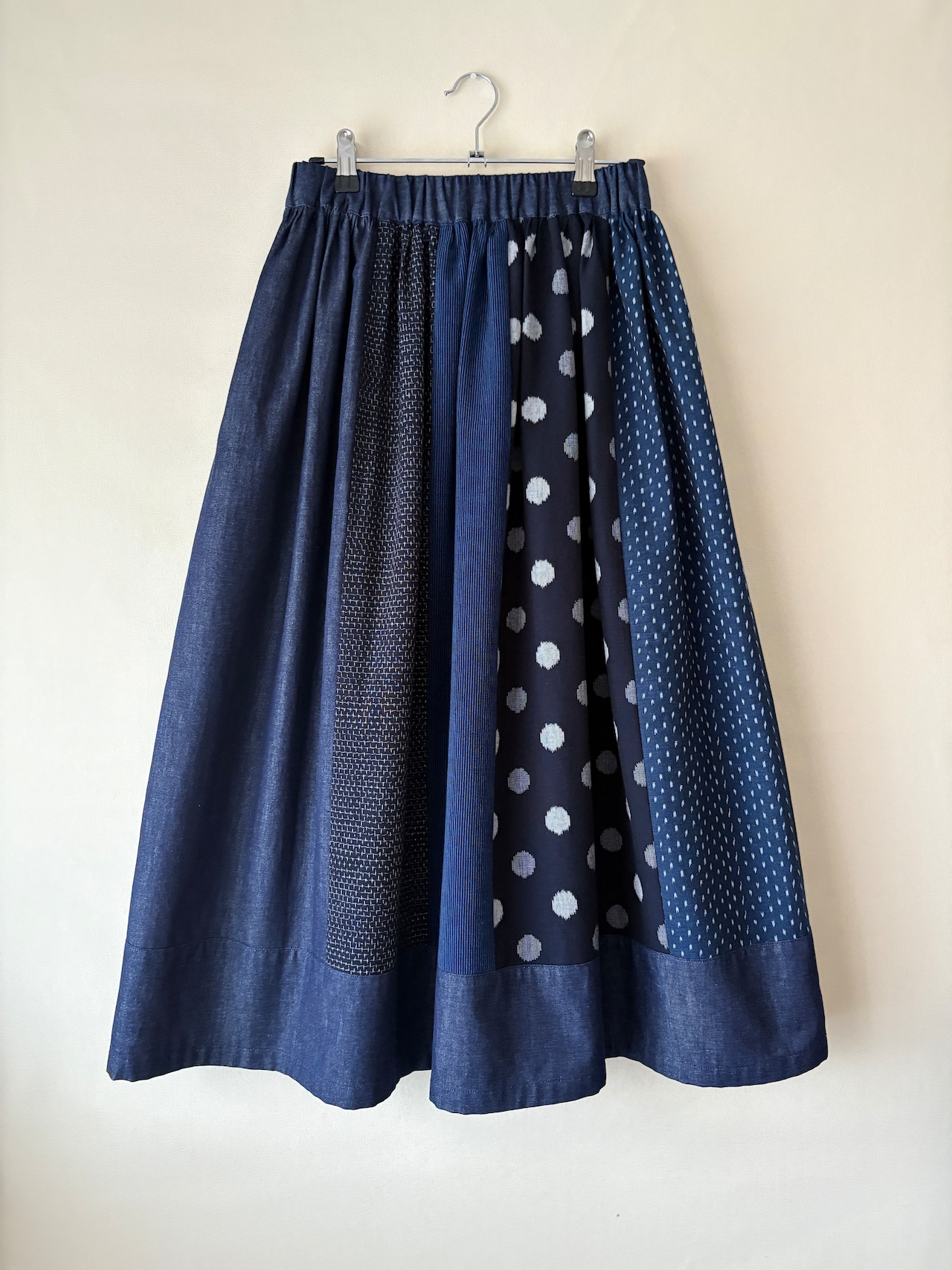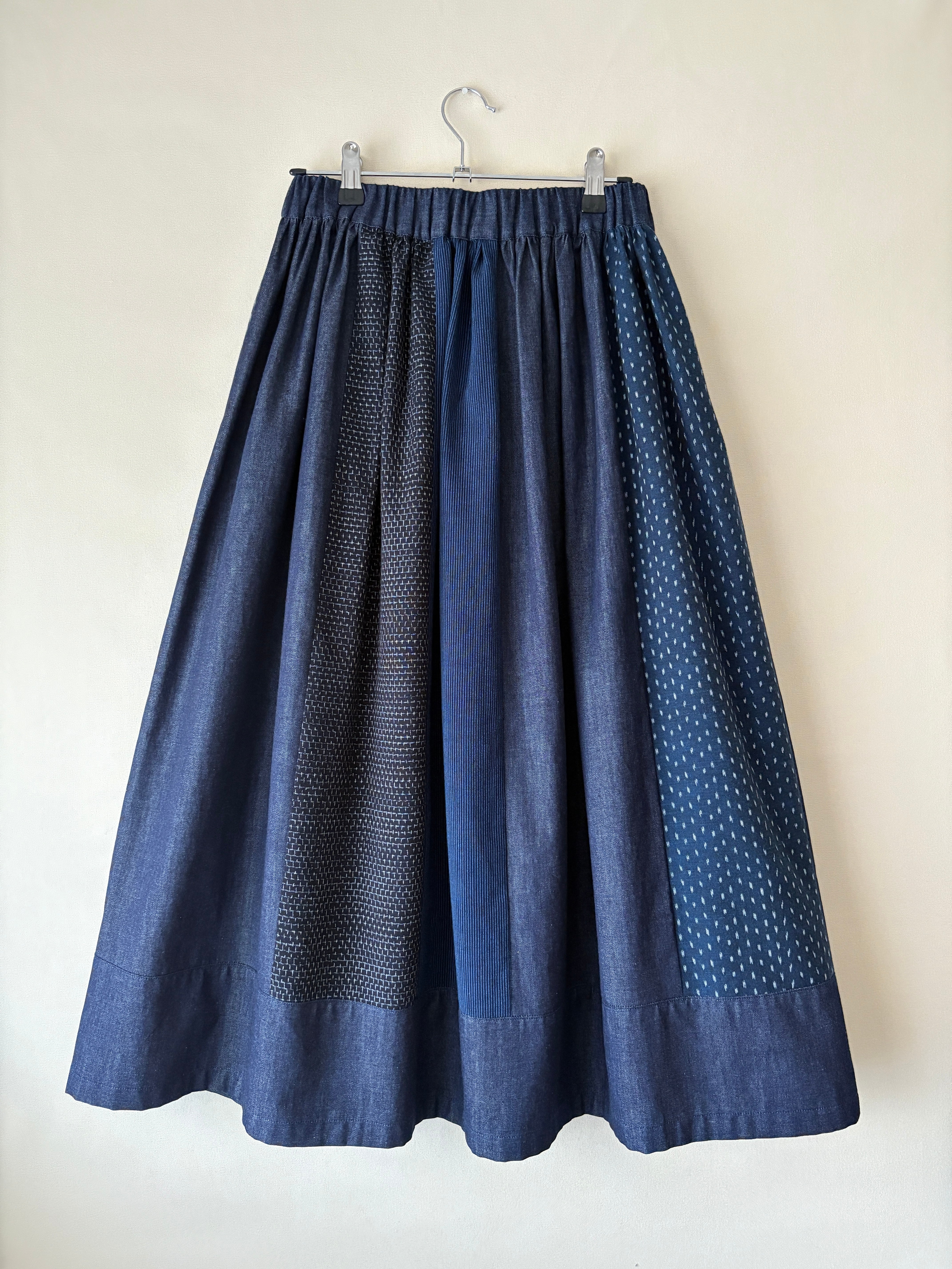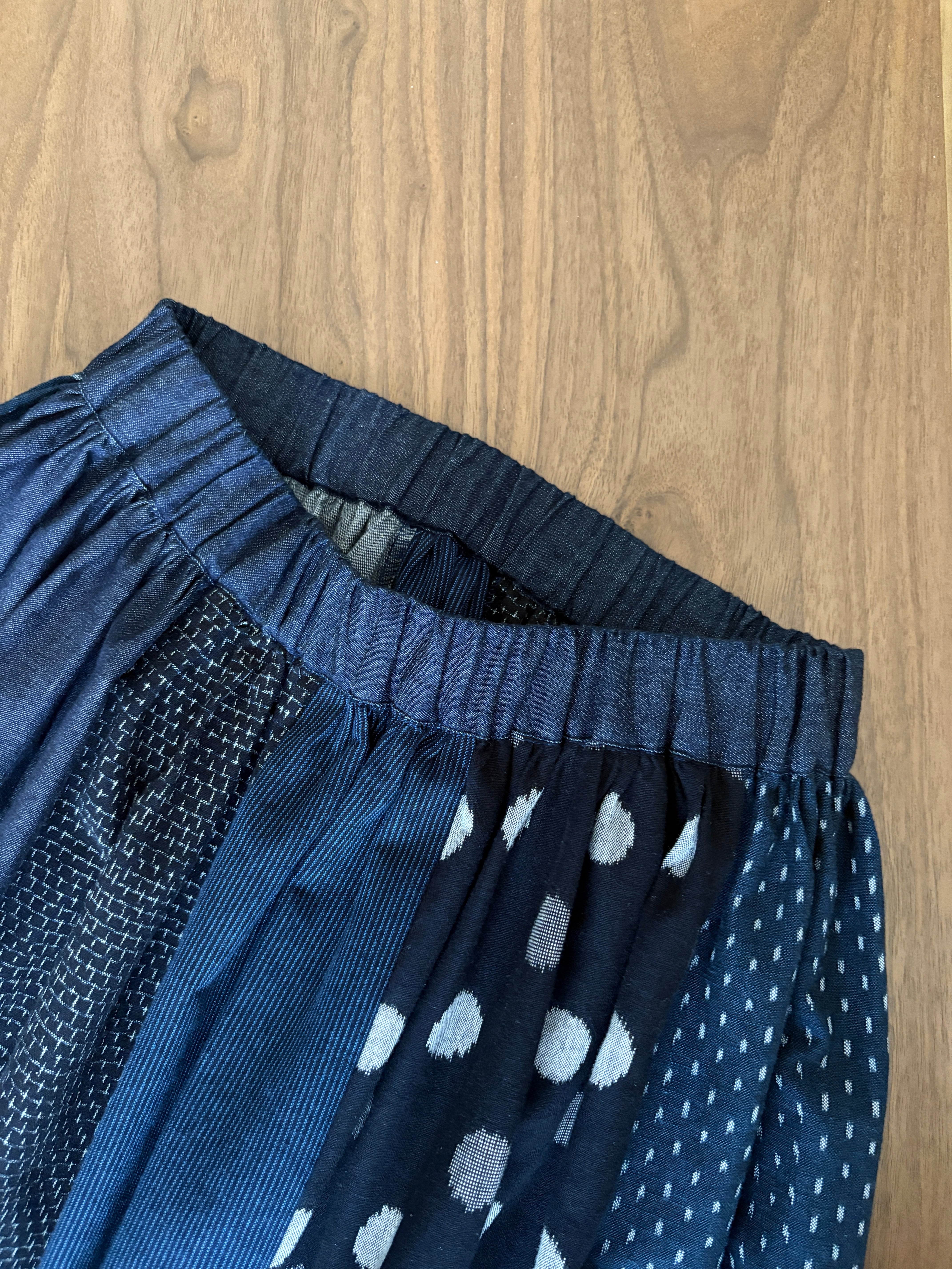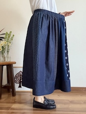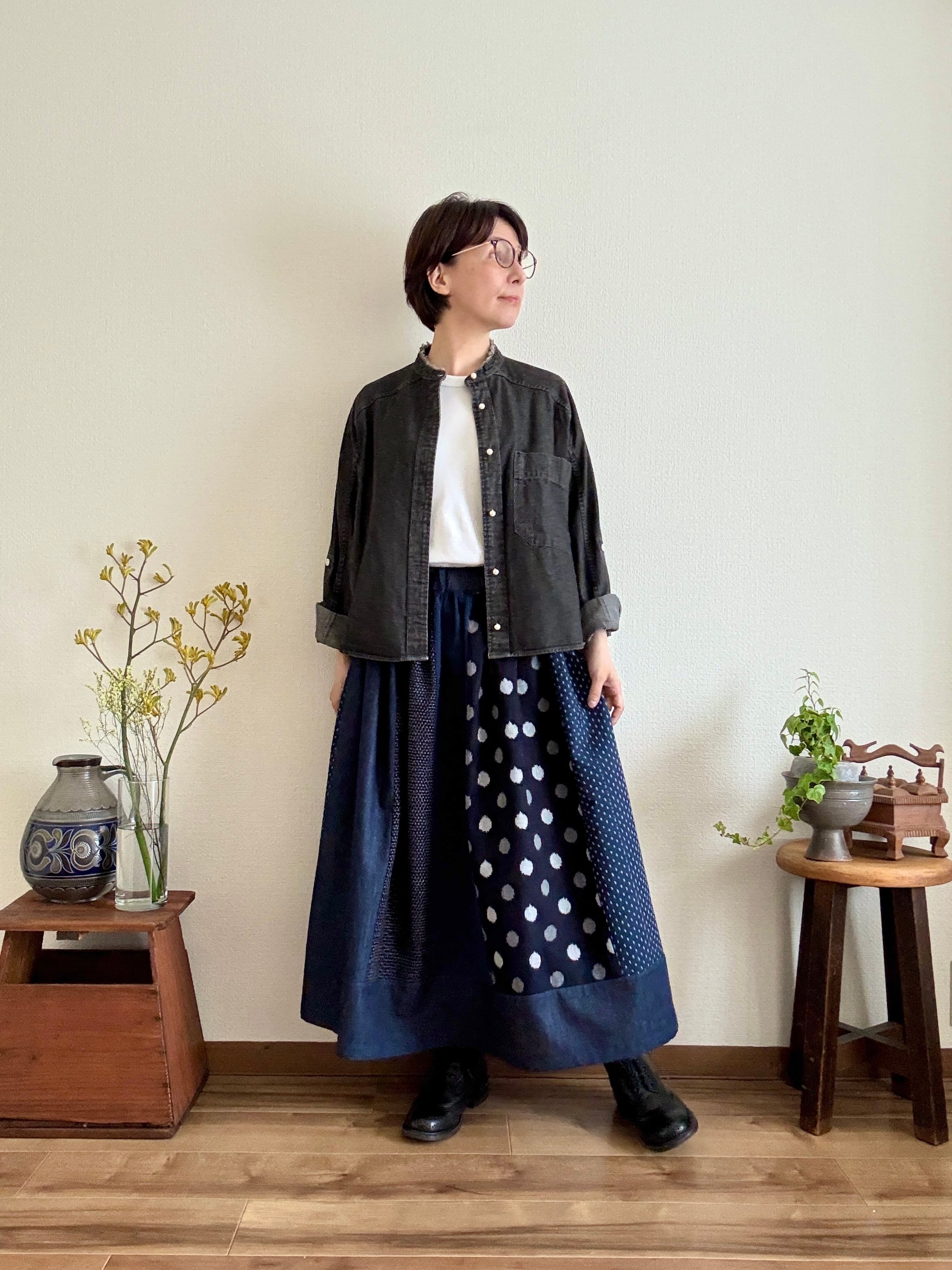 「久留米絣」の新反物と「児島デニム」2つの素材を掛け合わせたスカートは、職人さんたちの技術と情熱が詰まった特別な一枚です。手作業だからこそ生まれる温かみ、そして大量生産では決して味わえない魅力をぜひ感じてください。