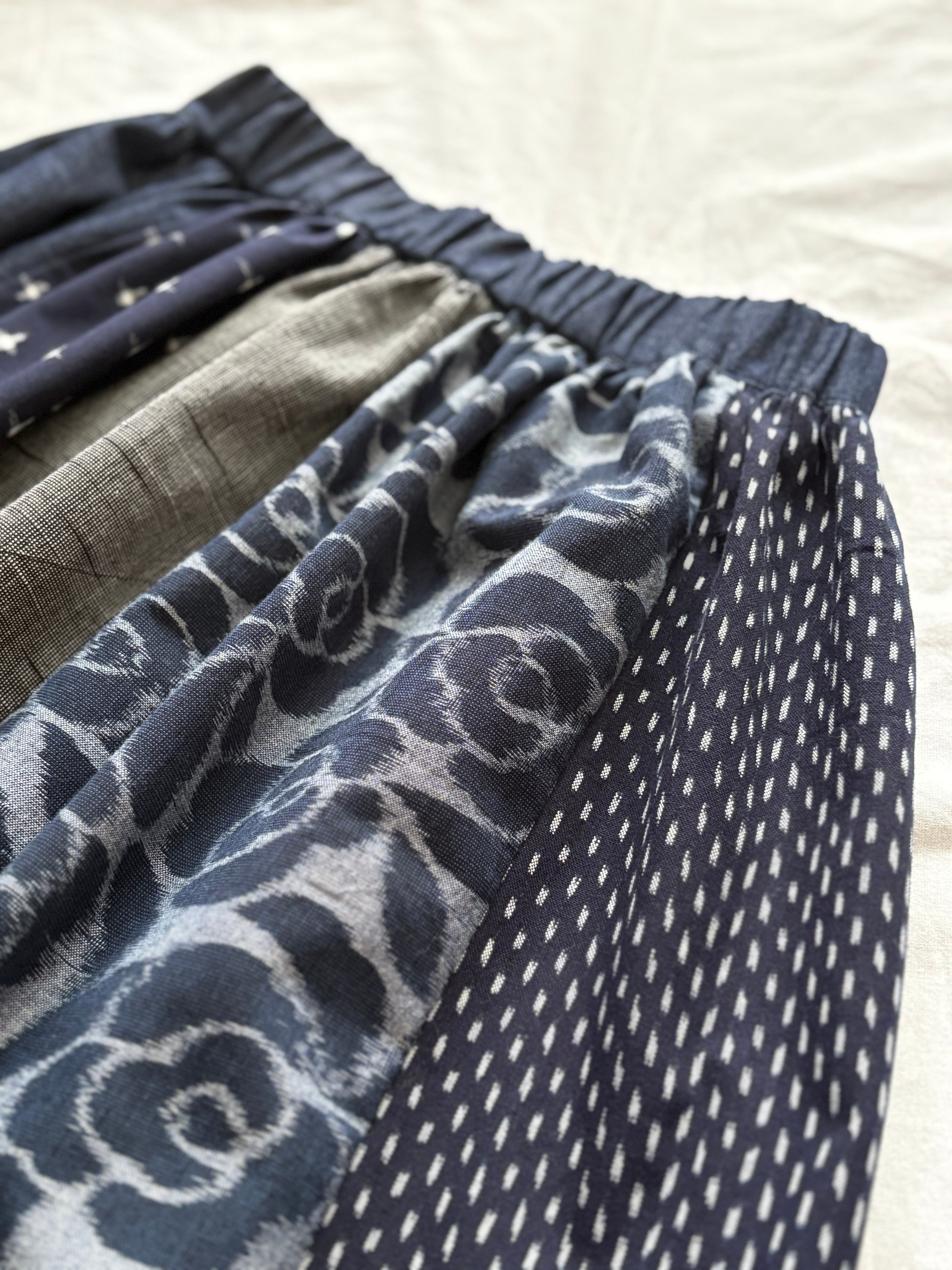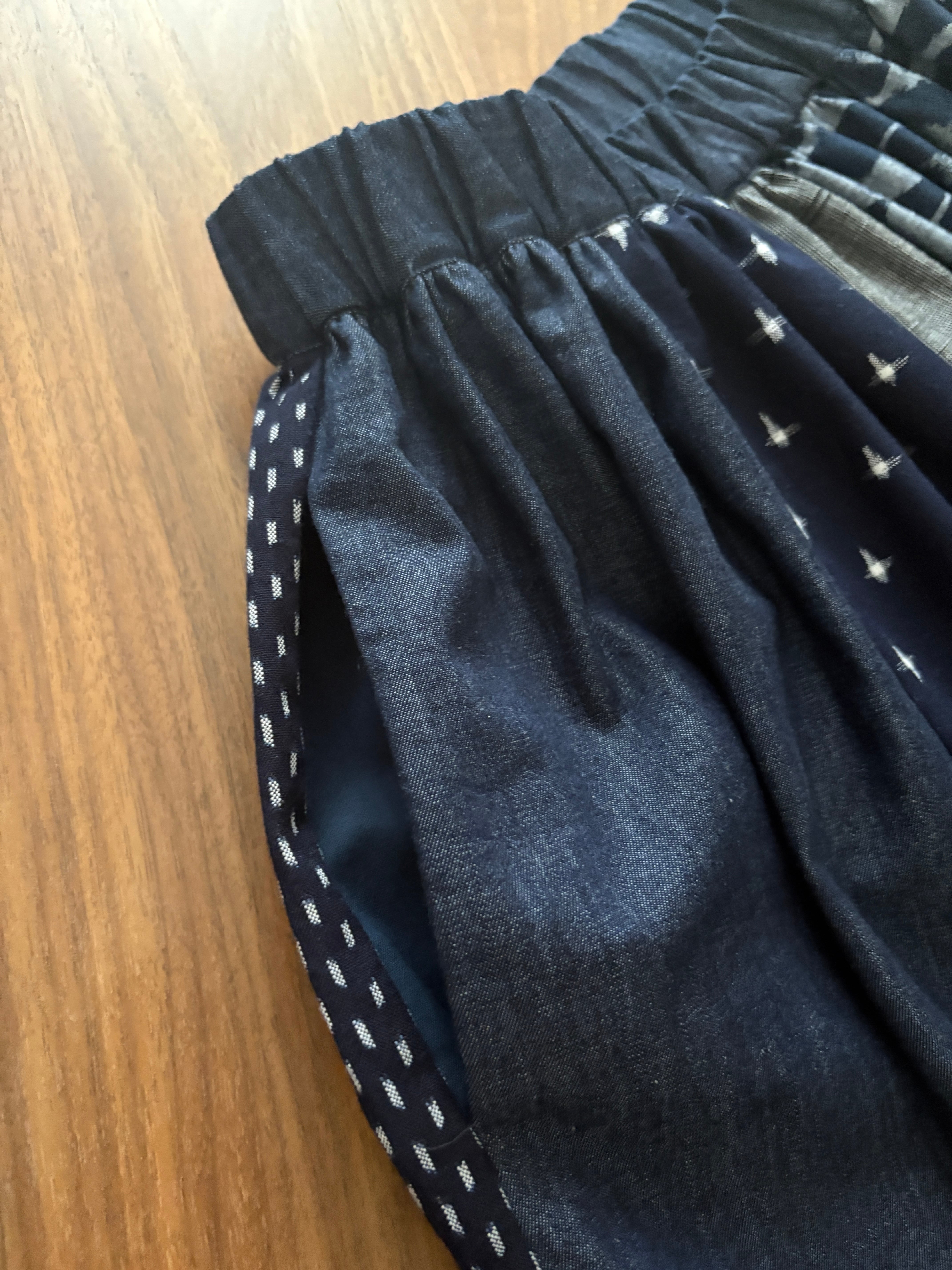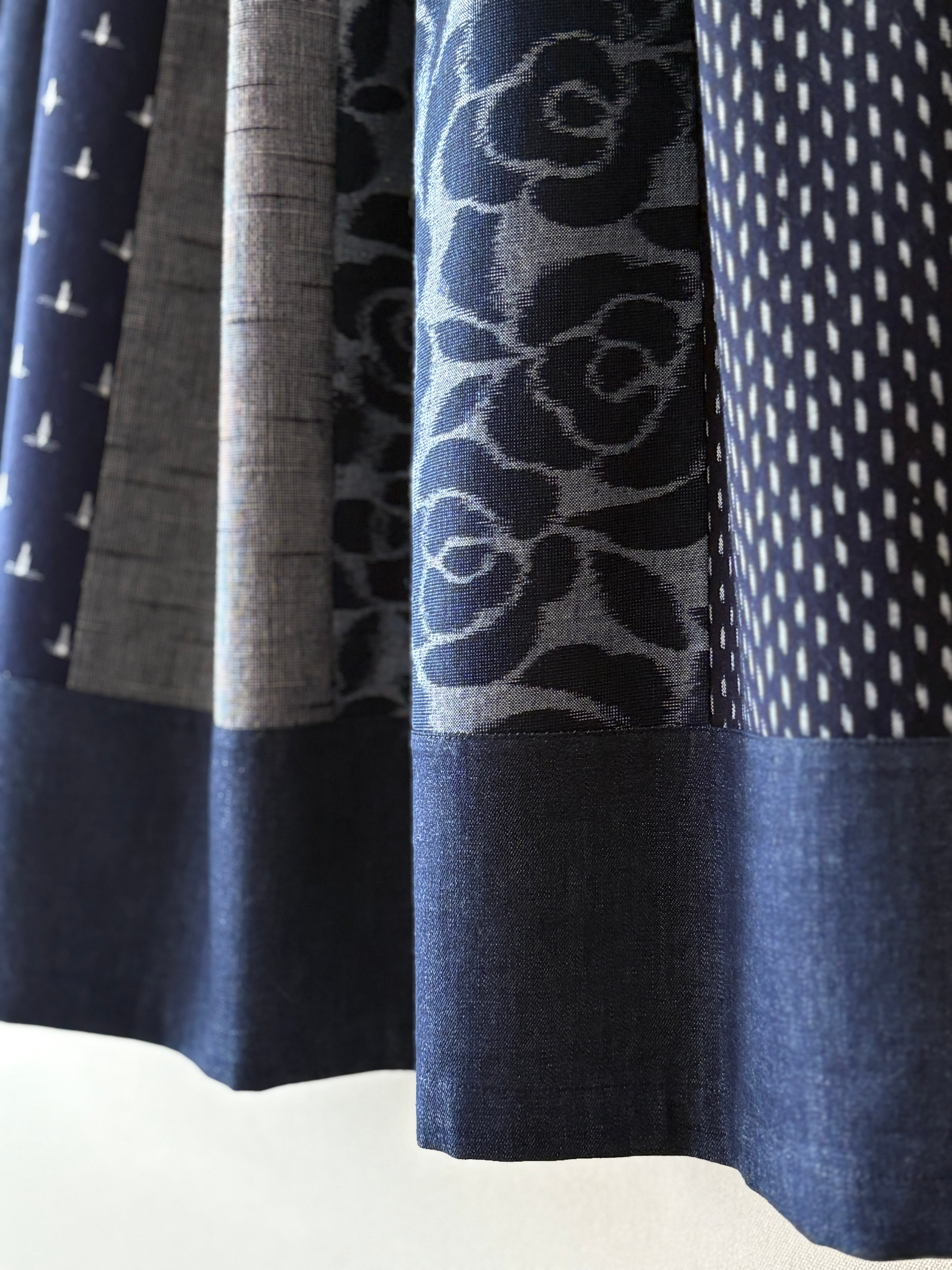 「久留米絣」の新反物と「児島デニム」2つの素材を掛け合わせたスカートは、職人さんたちの技術と情熱が詰まった特別な一枚です。手作業だからこそ生まれる温かみ、そして大量生産では決して味わえない魅力をぜひ感じてください。
