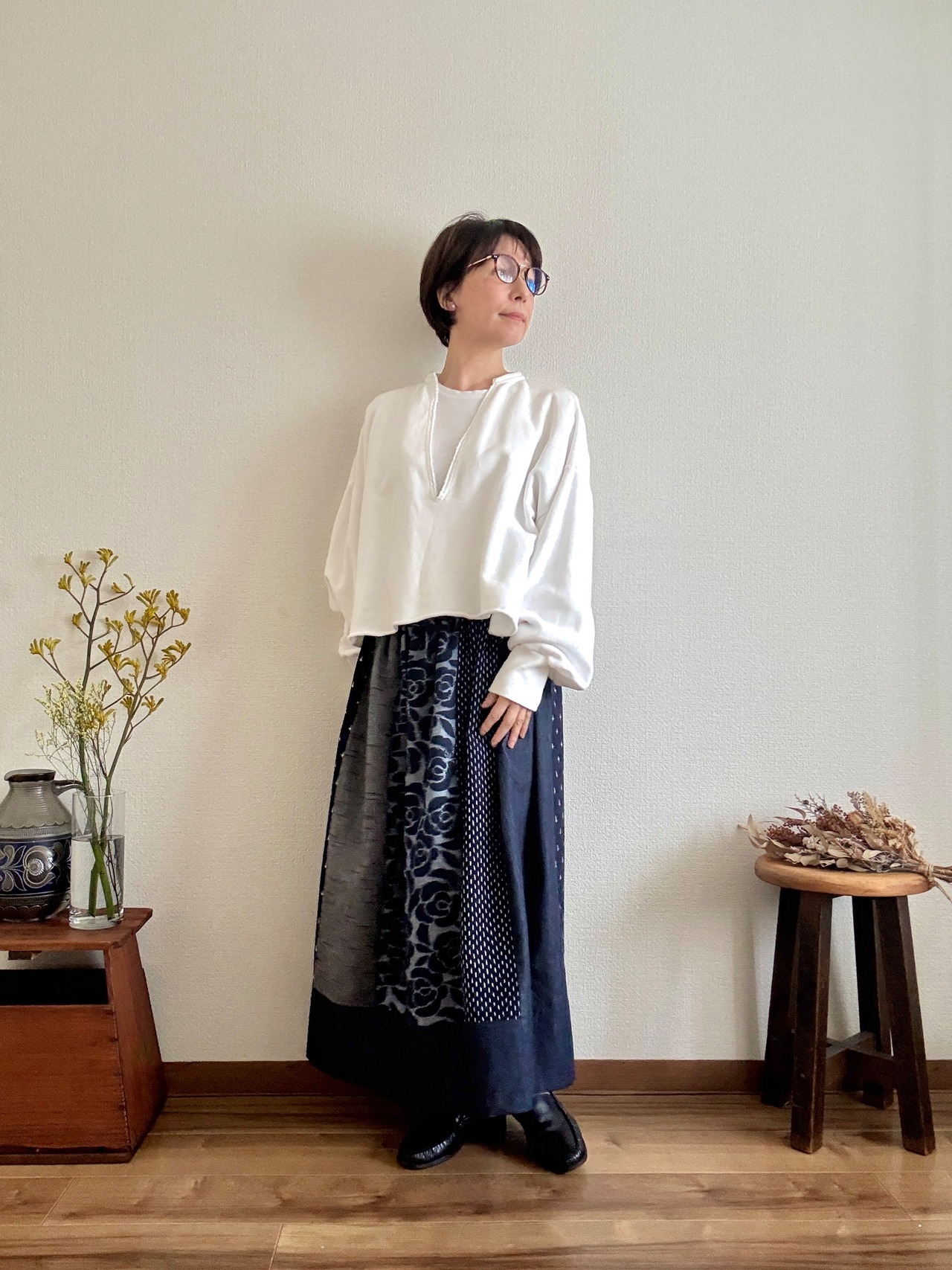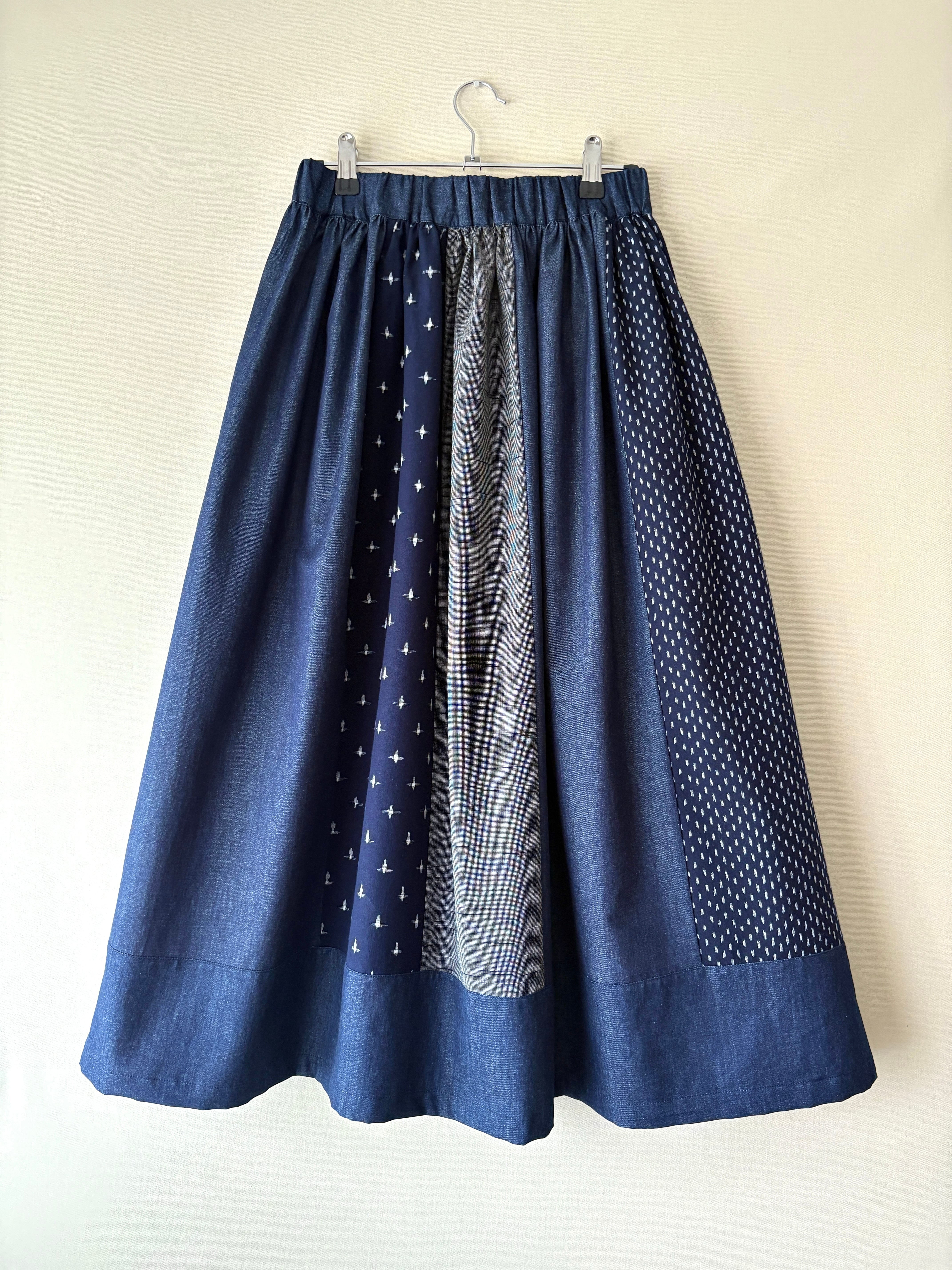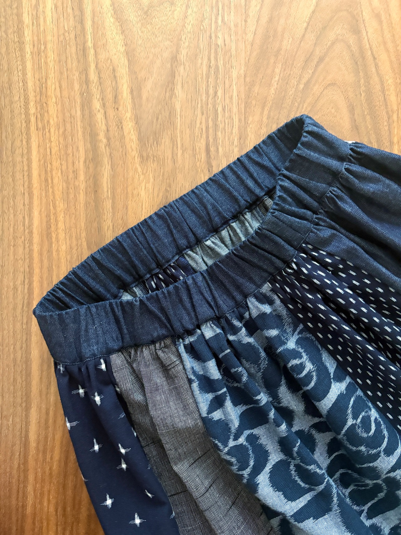「久留米絣」の新反物と「児島デニム」2つの素材を掛け合わせたスカートは、職人さんたちの技術と情熱が詰まった特別な一枚です。手作業だからこそ生まれる温かみ、そして大量生産では決して味わえない魅力をぜひ感じてください。
