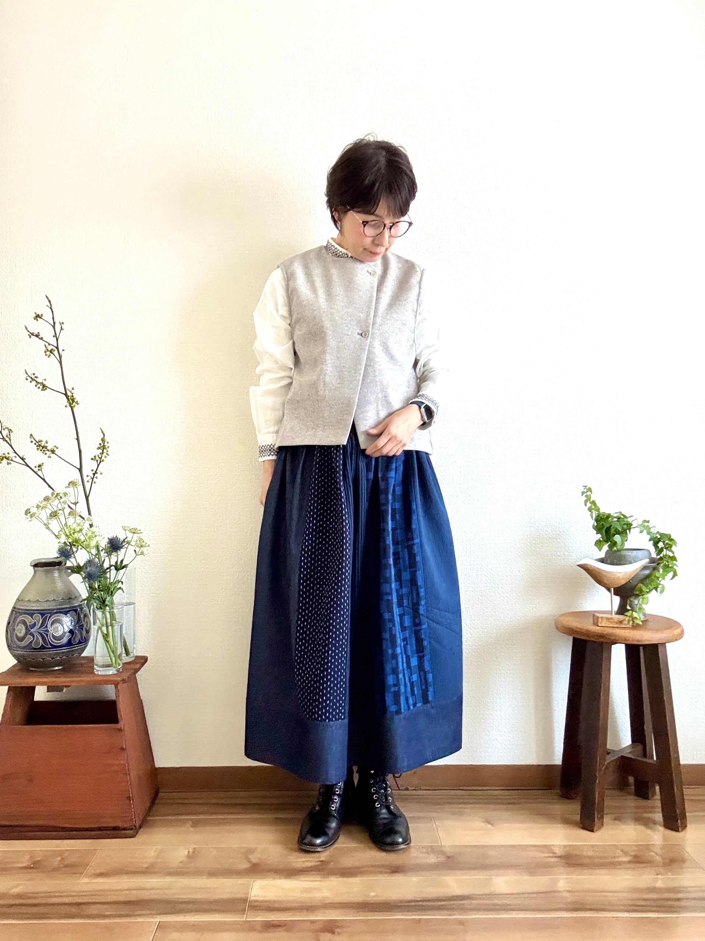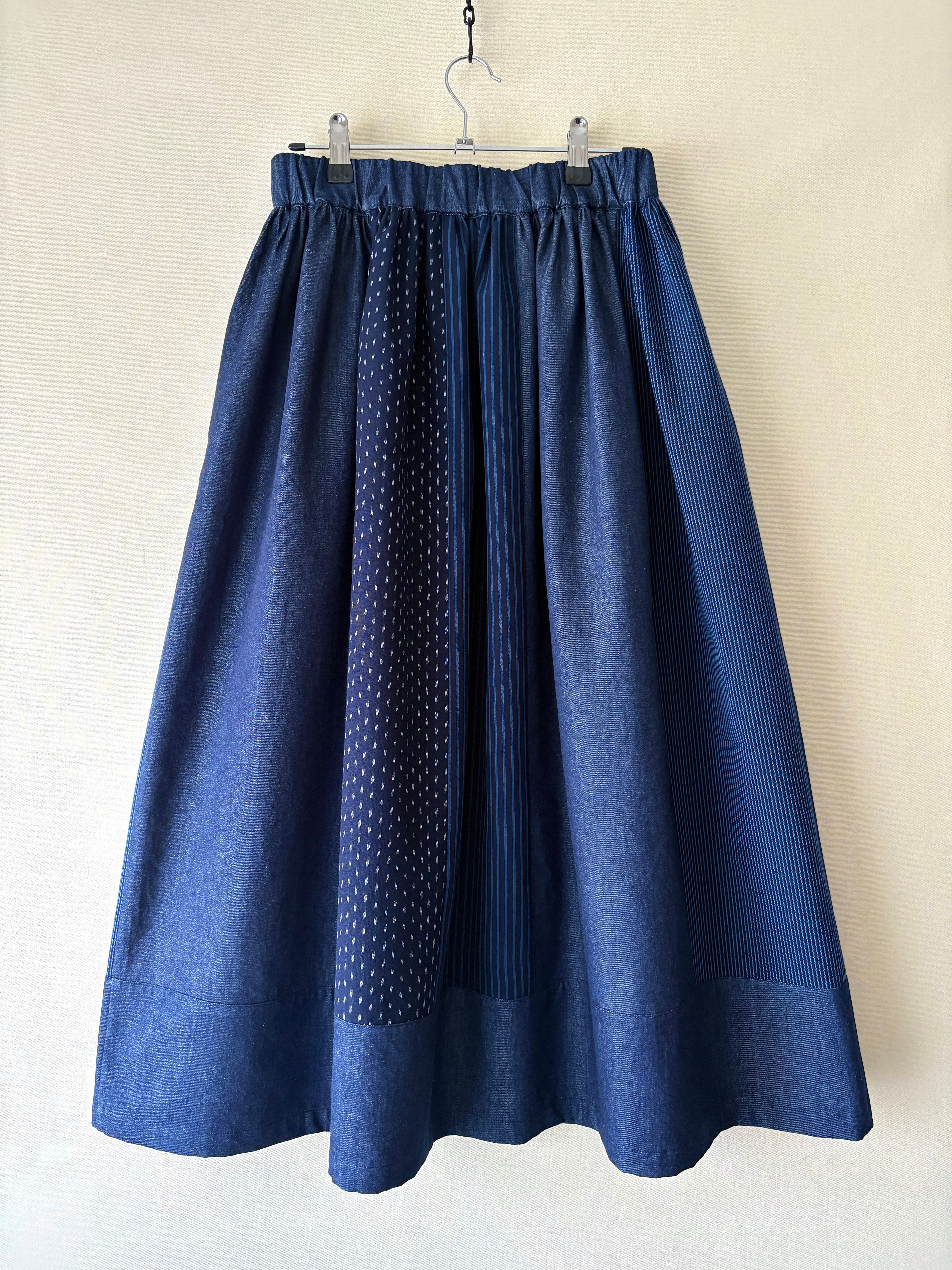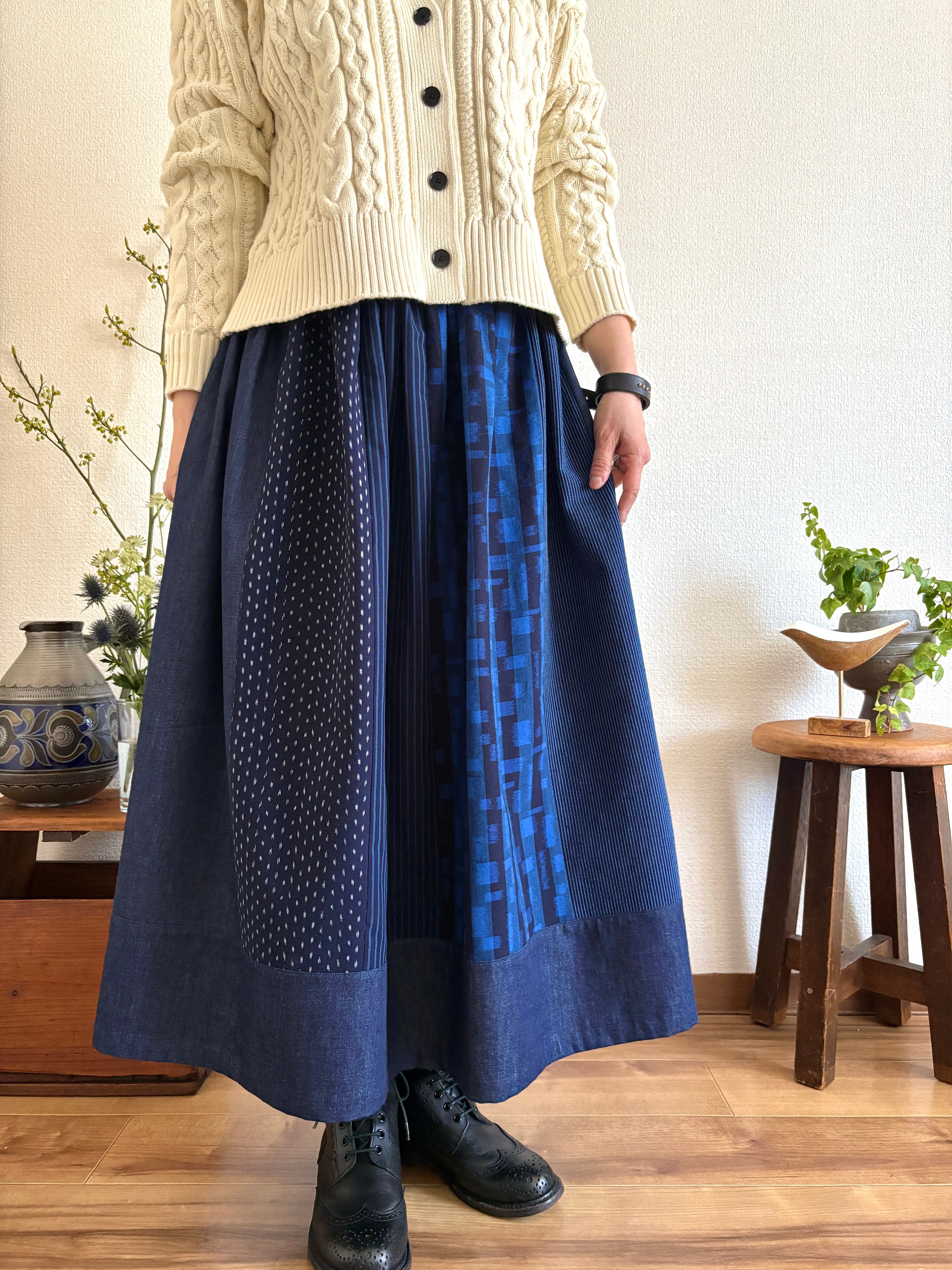 「久留米絣」の新反物と「児島デニム」2つの素材を掛け合わせたスカートは、職人さんたちの技術と情熱が詰まった特別な一枚です。手作業だからこそ生まれる温かみ、そして大量生産では決して味わえない魅力をぜひ感じてください。