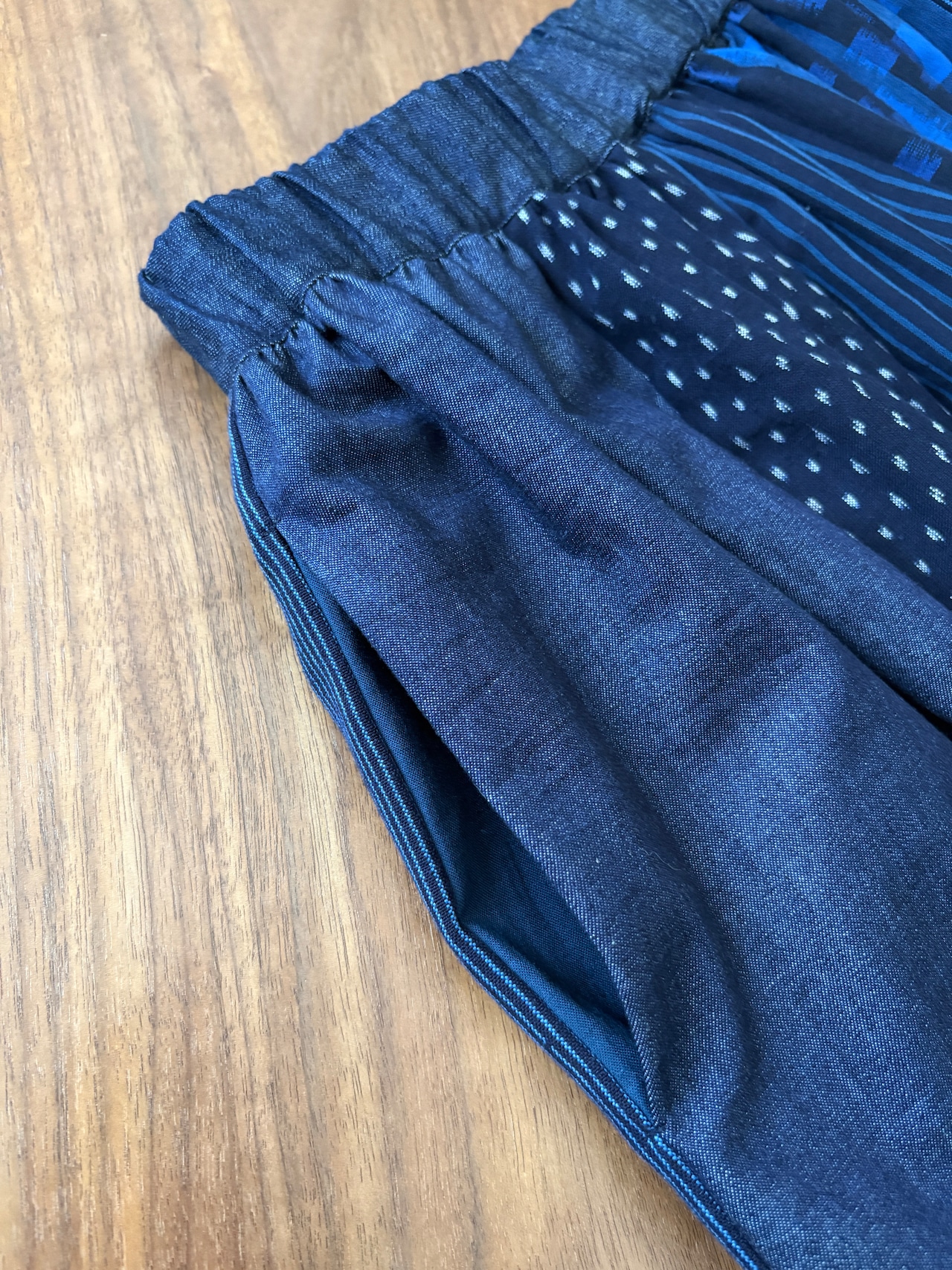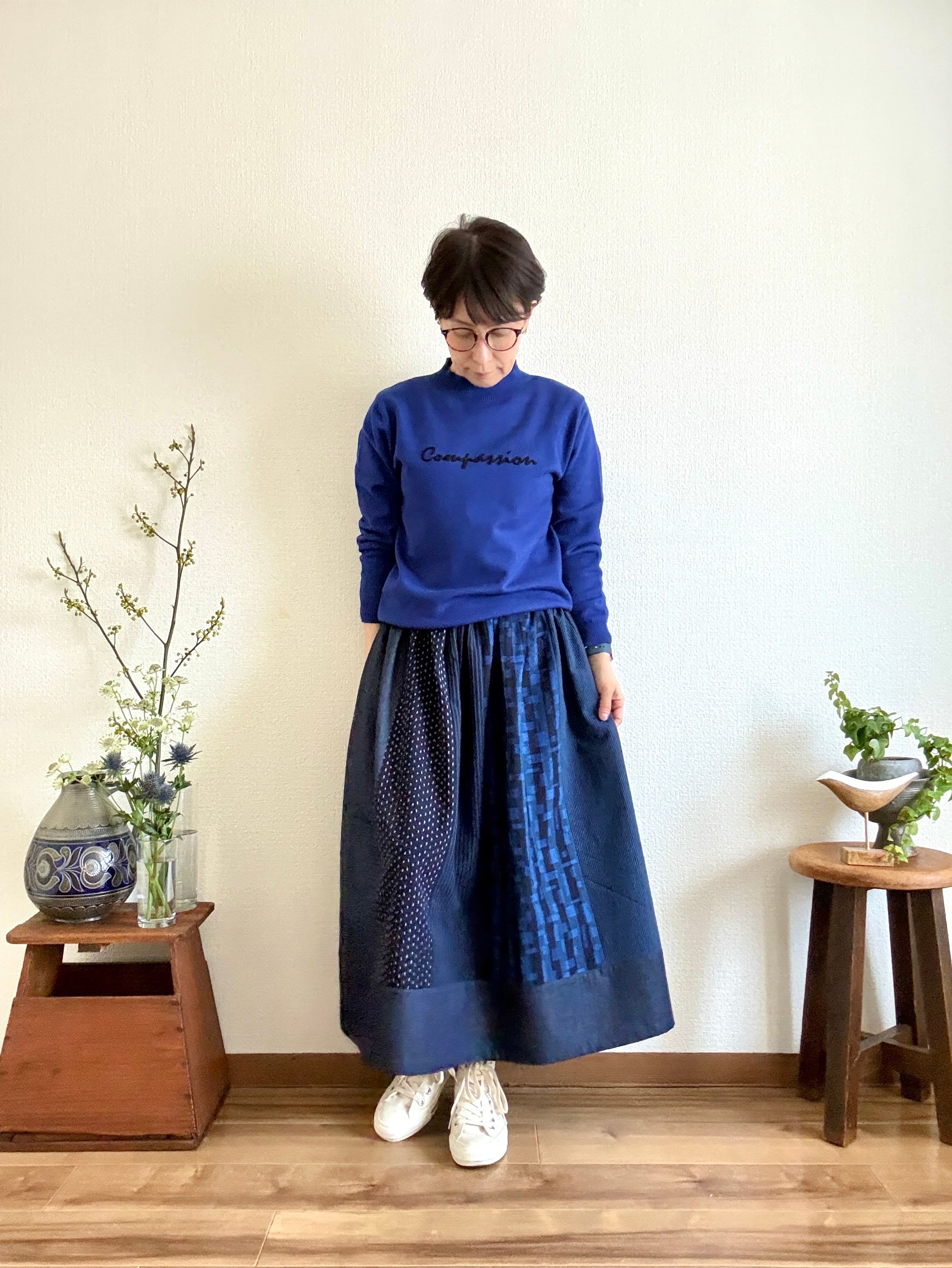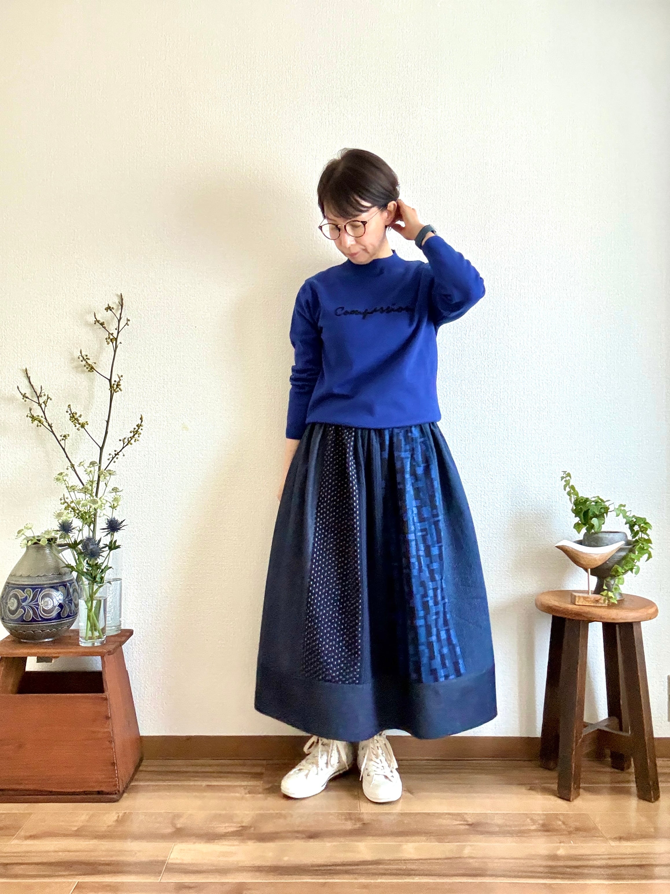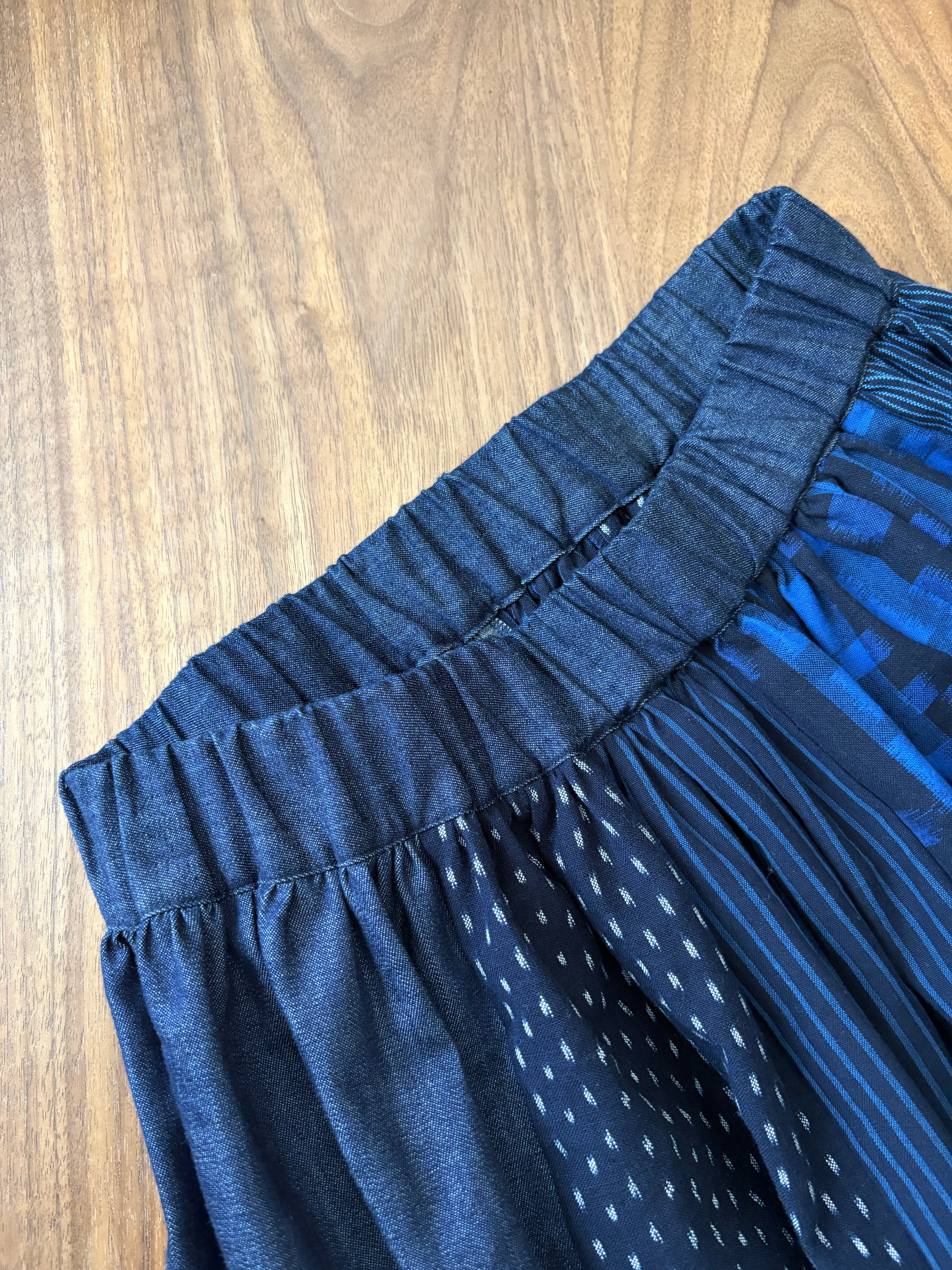 「久留米絣」の新反物と「児島デニム」2つの素材を掛け合わせたスカートは、職人さんたちの技術と情熱が詰まった特別な一枚です。手作業だからこそ生まれる温かみ、そして大量生産では決して味わえない魅力をぜひ感じてください。