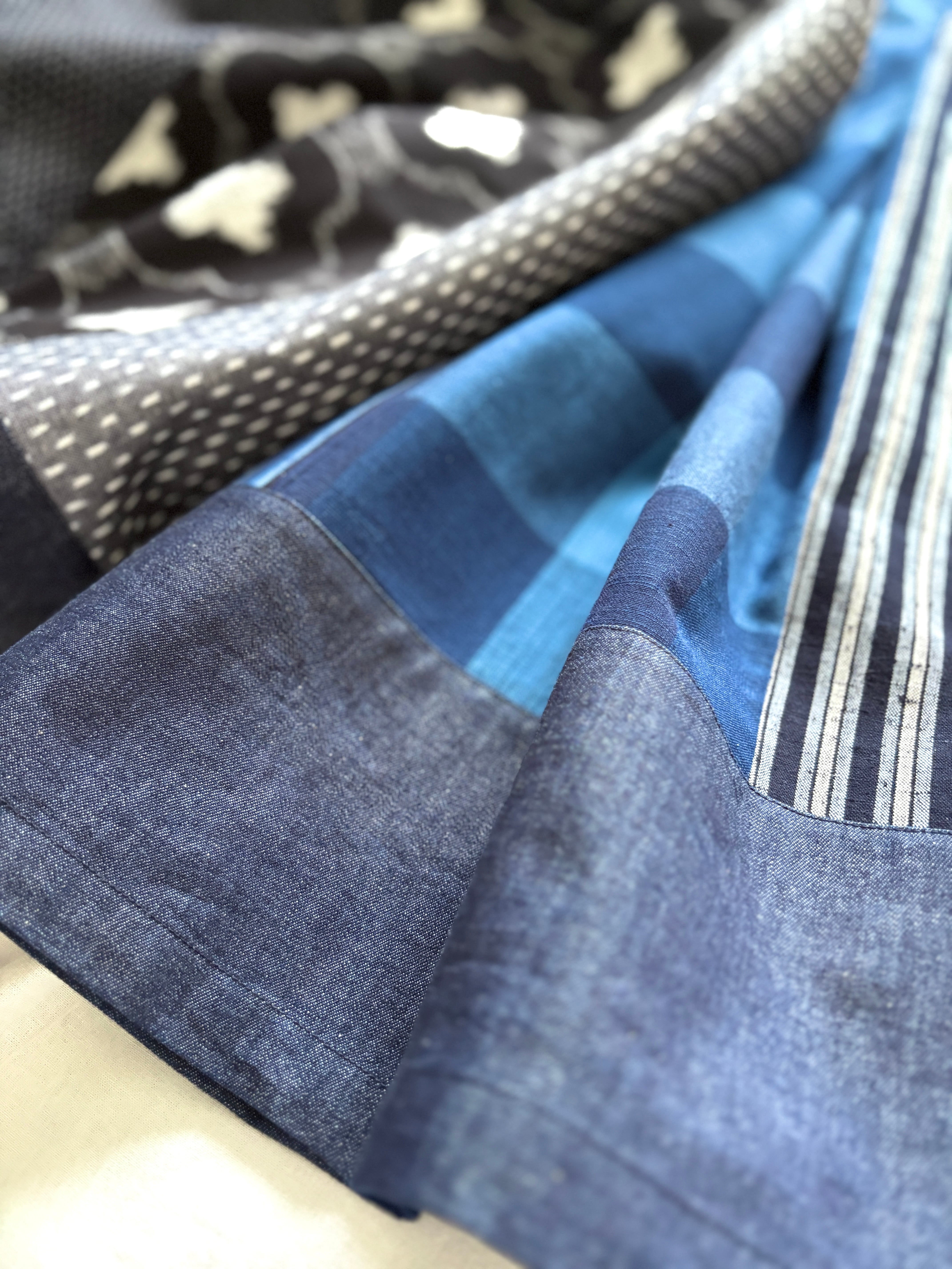 「久留米絣」の新反物と「児島デニム」2つの素材を掛け合わせたスカートは、職人さんたちの技術と情熱が詰まった特別な一枚です。手作業だからこそ生まれる温かみ、そして大量生産では決して味わえない魅力をぜひ感じてください。