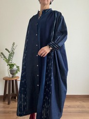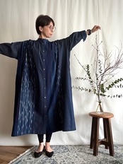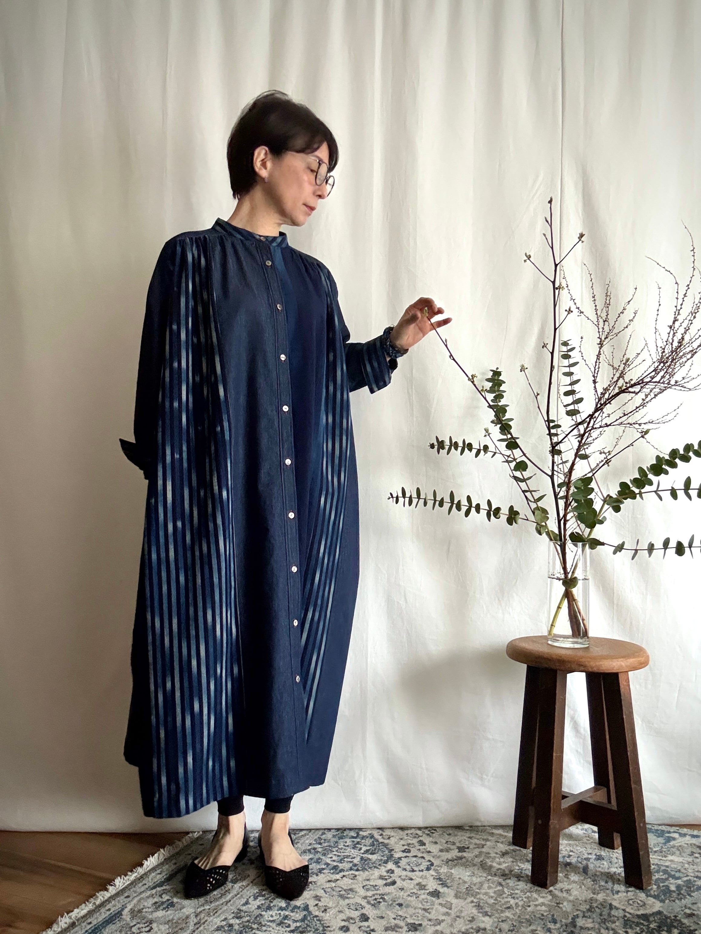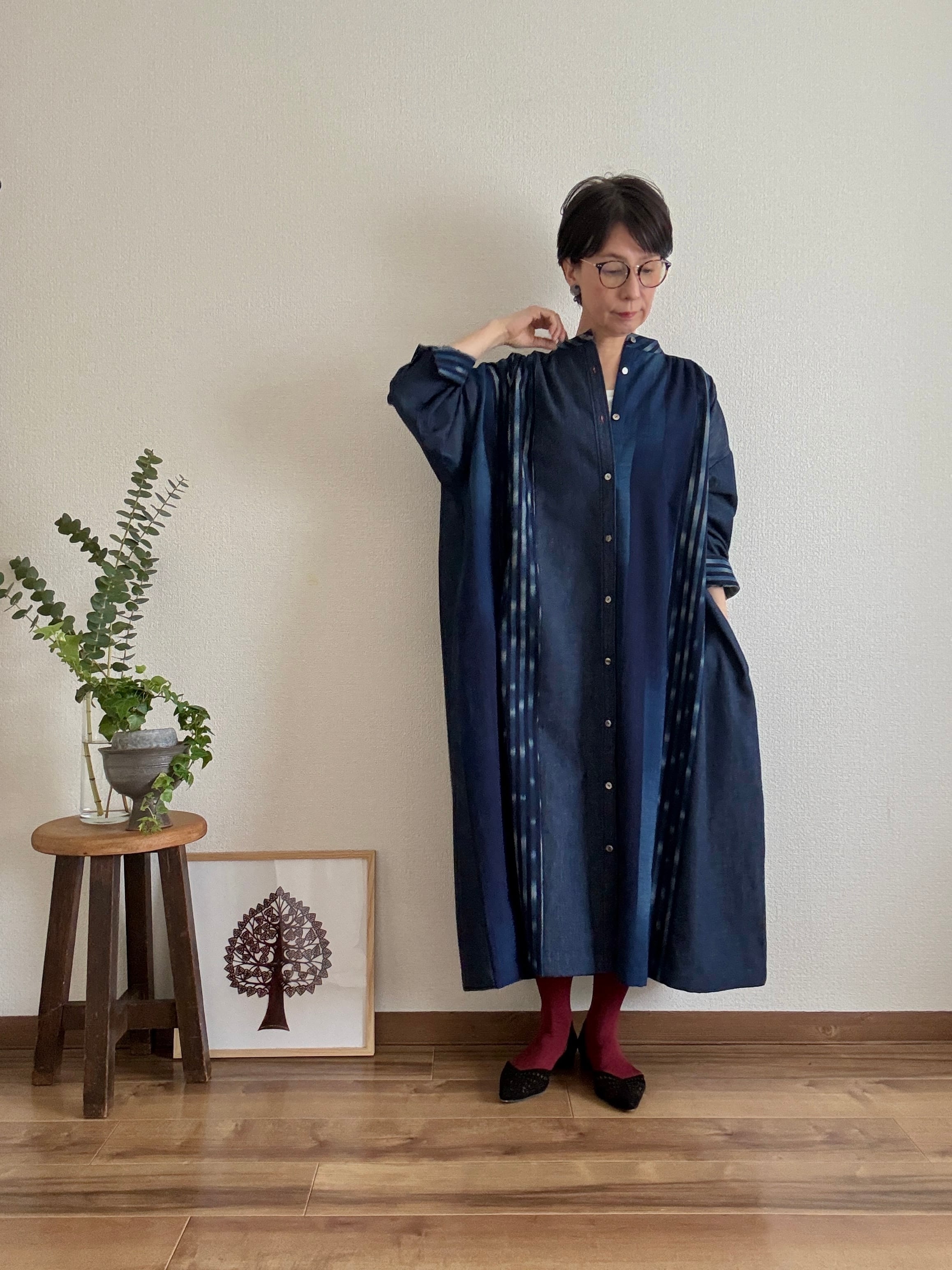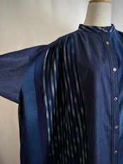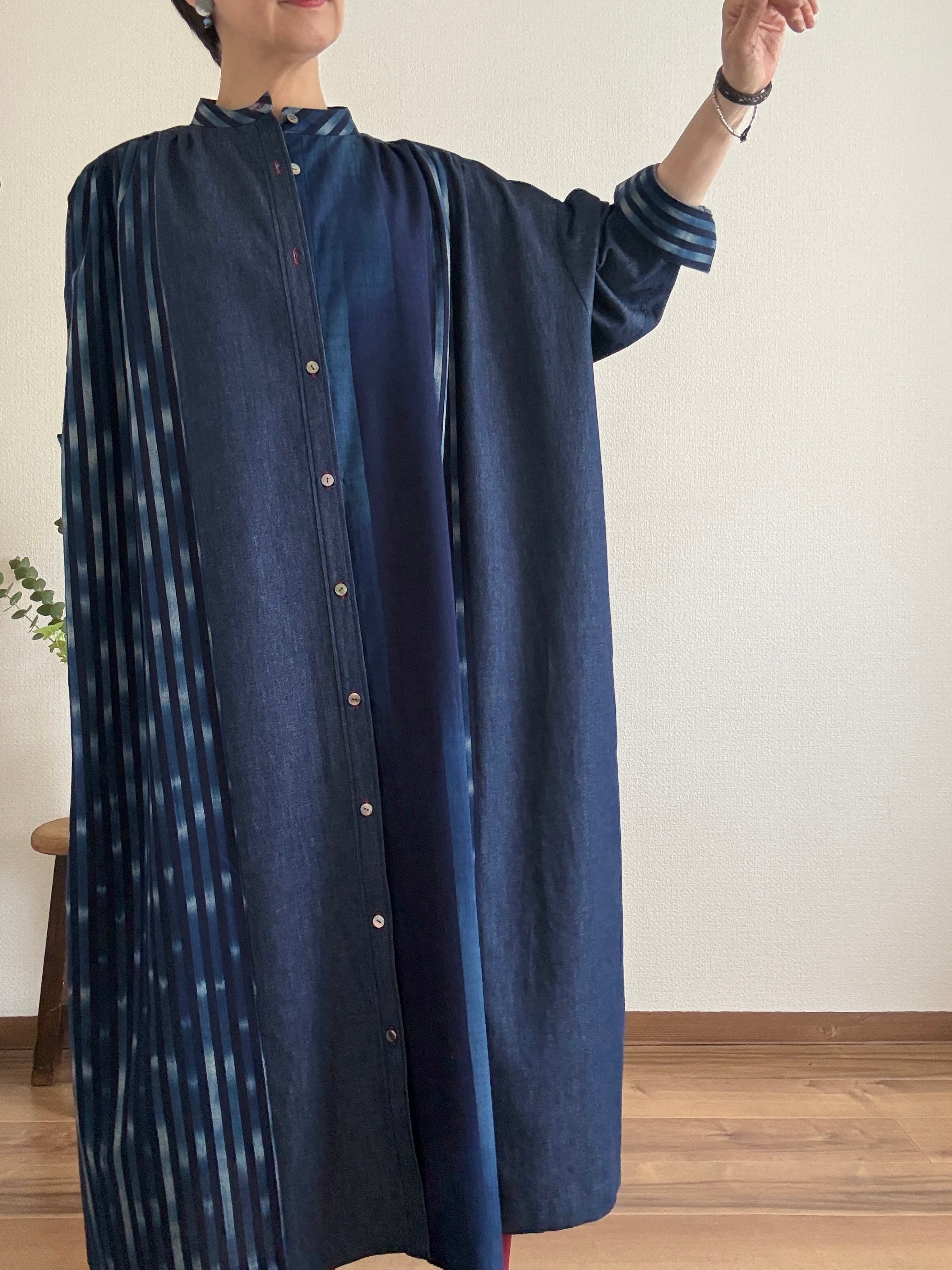 久留米絣と児島デニムを組み合わせて仕立てた、藍のグラデーションが美しいパッチワークワンピース。