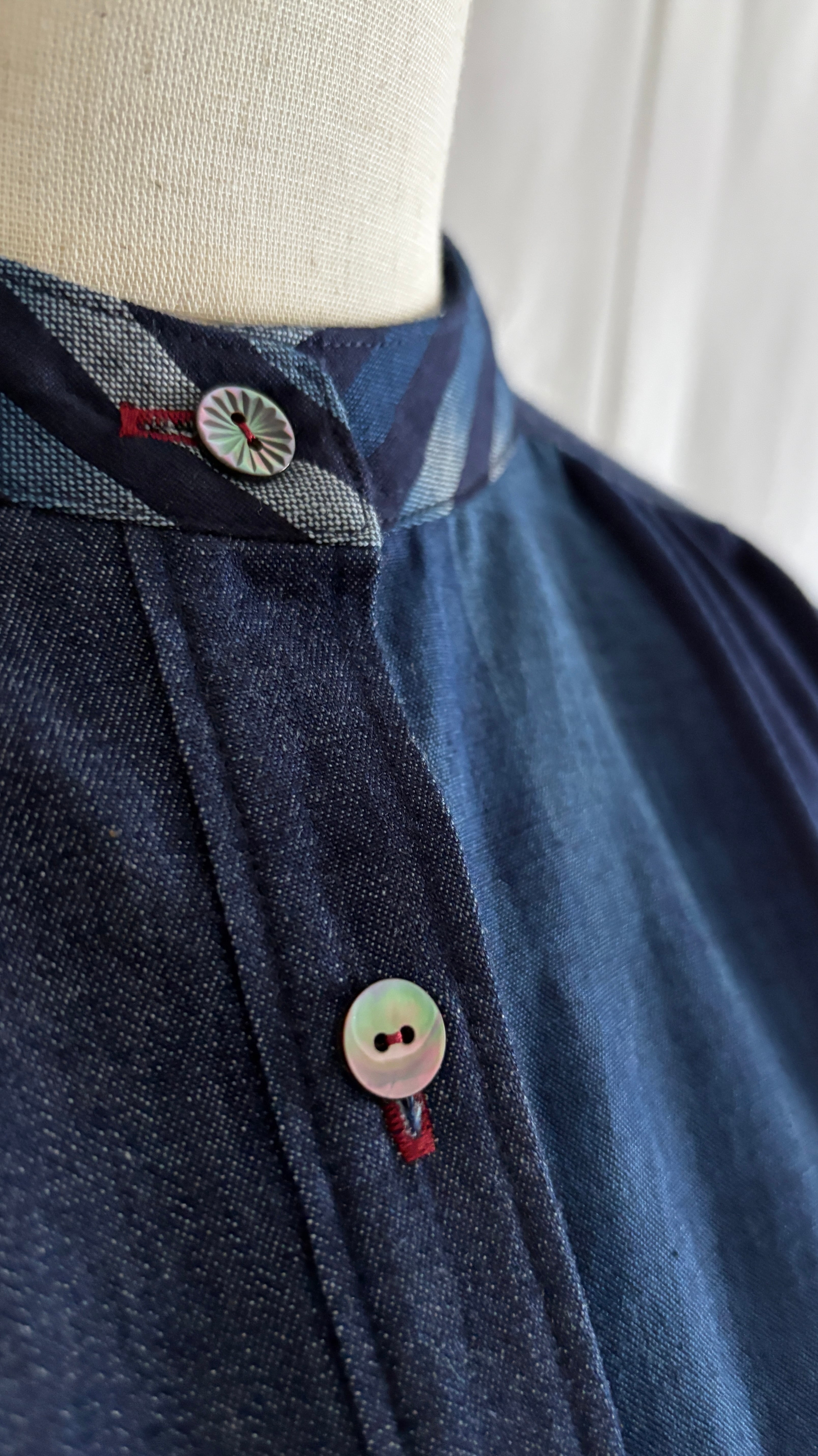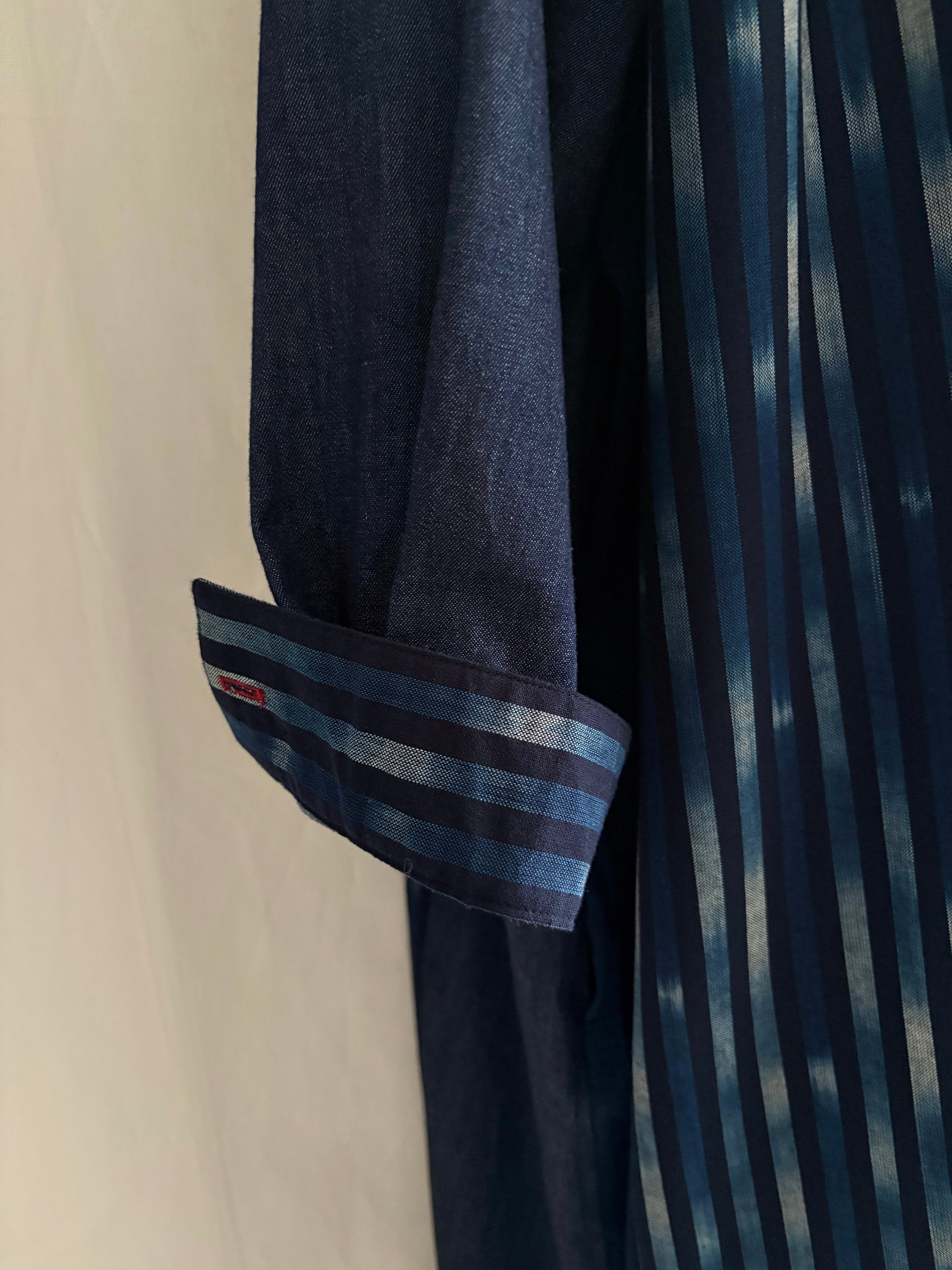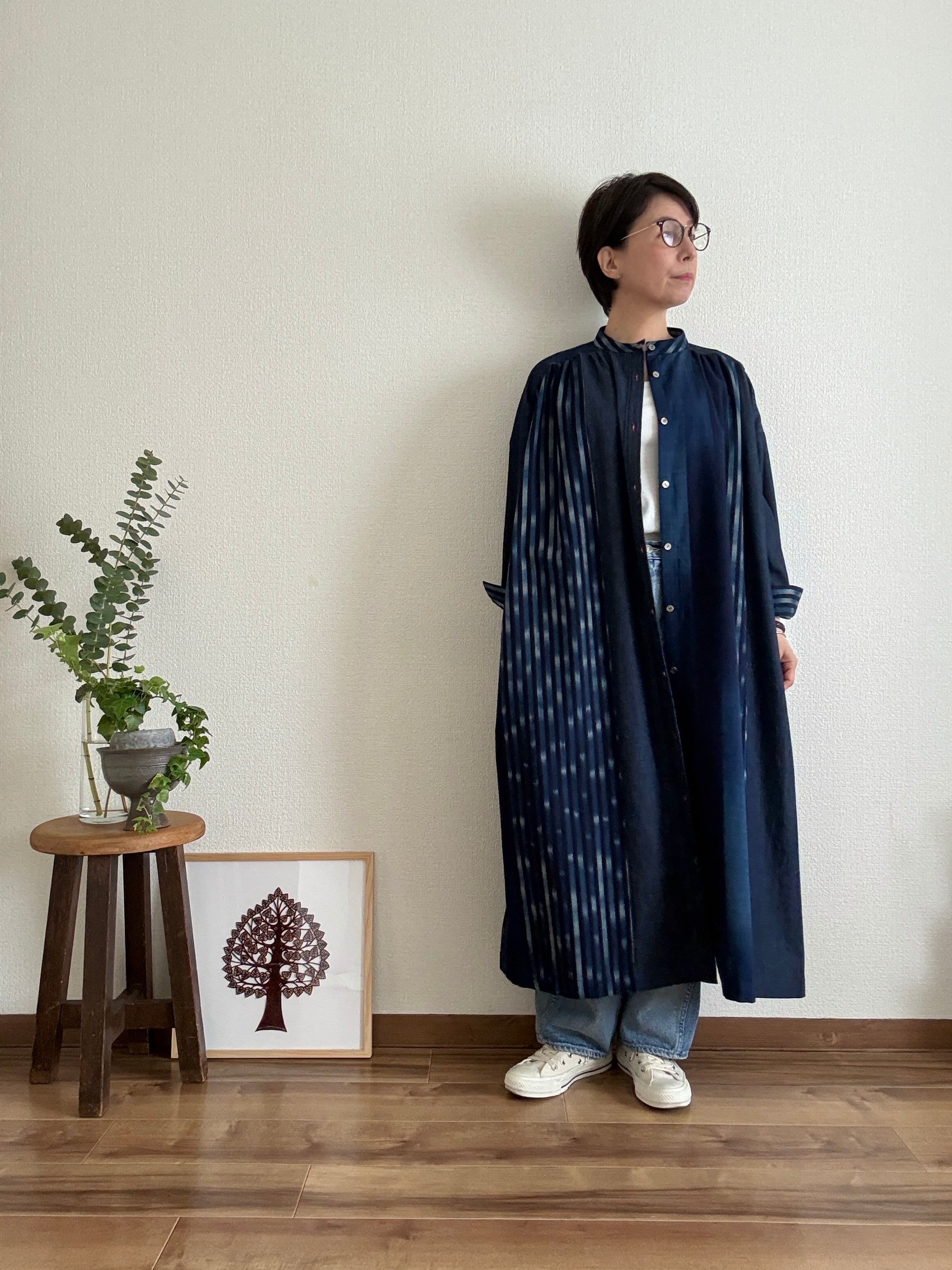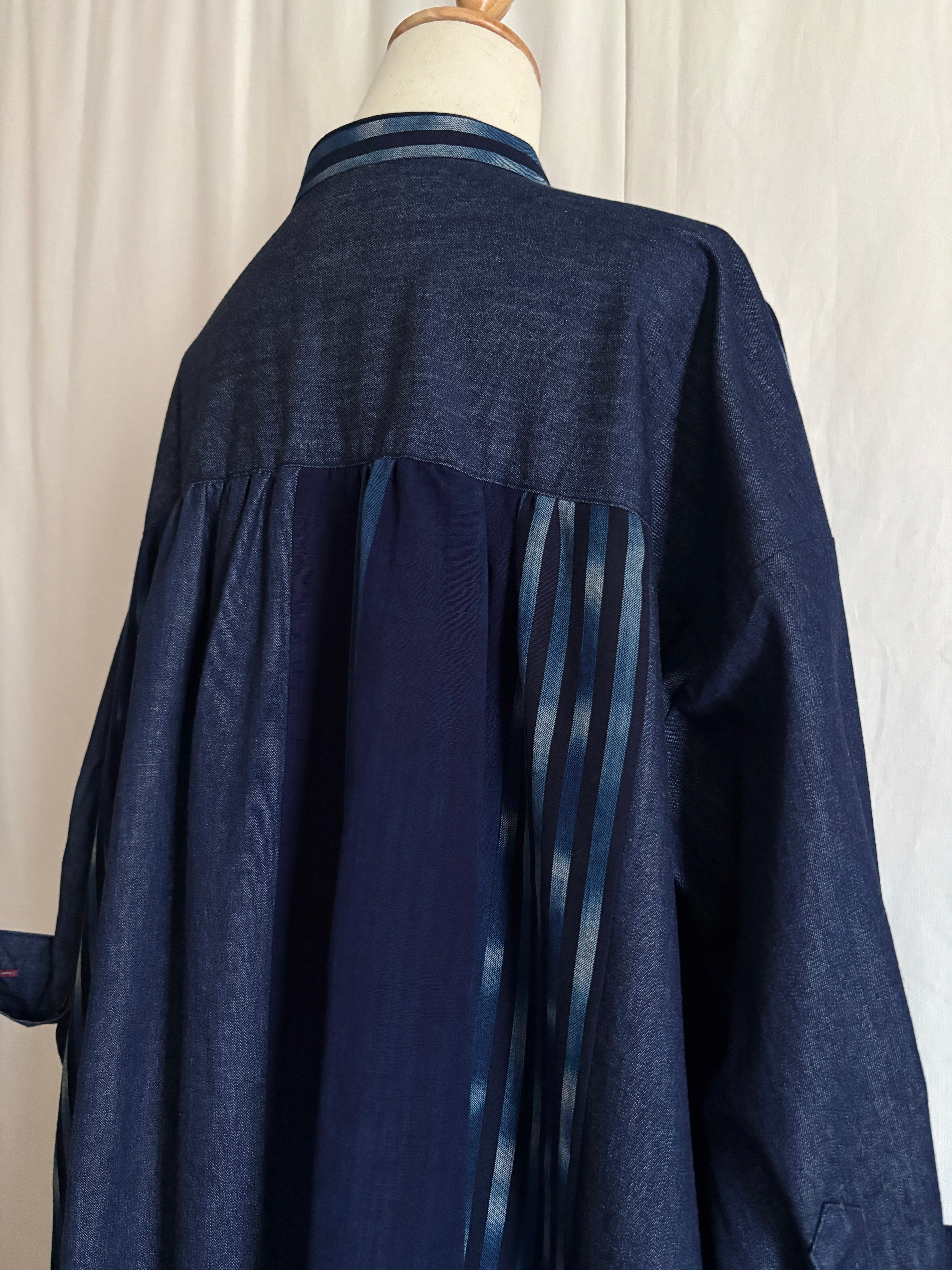 久留米絣と児島デニムを組み合わせて仕立てた、藍のグラデーションが美しいパッチワークワンピース。