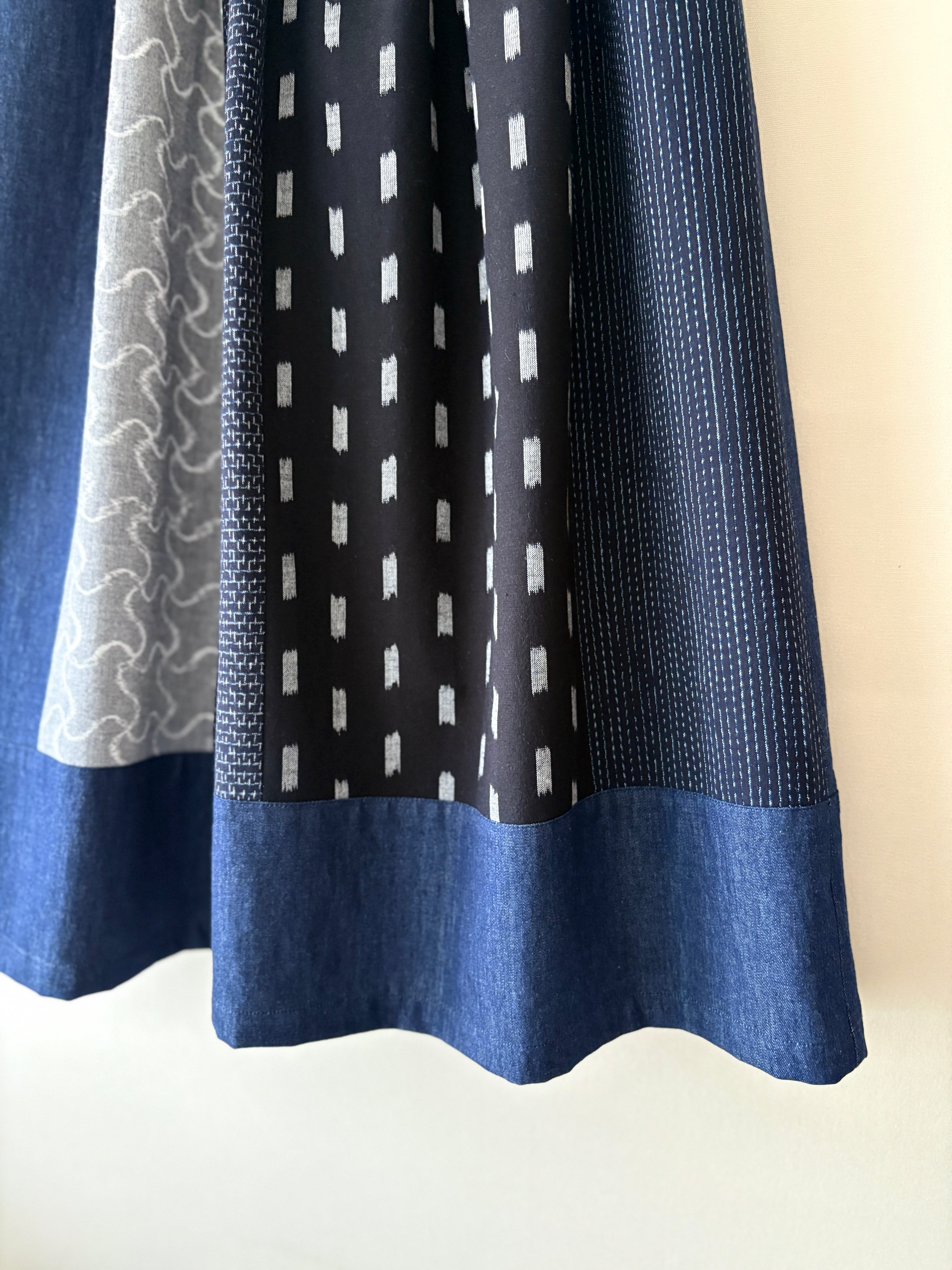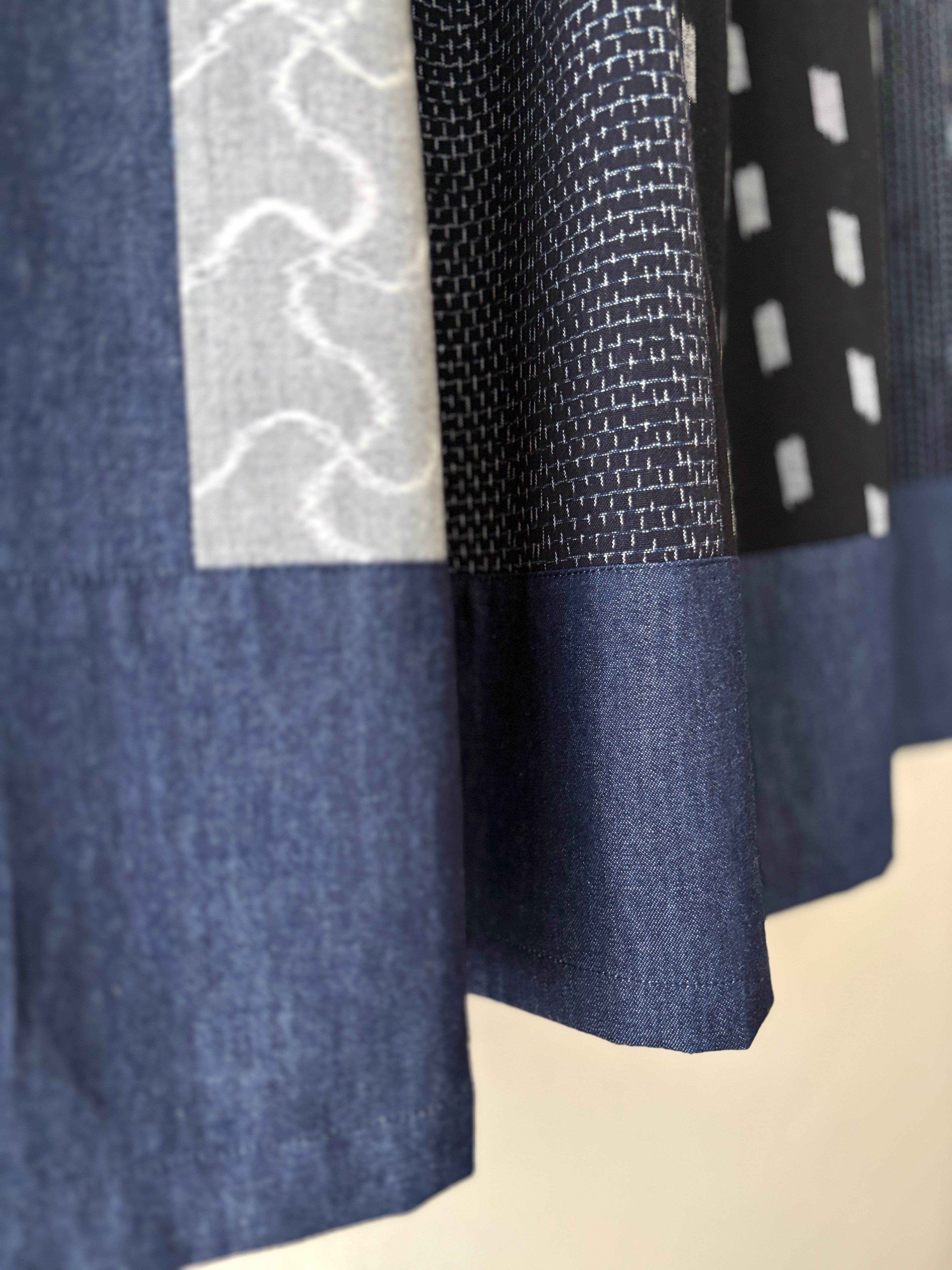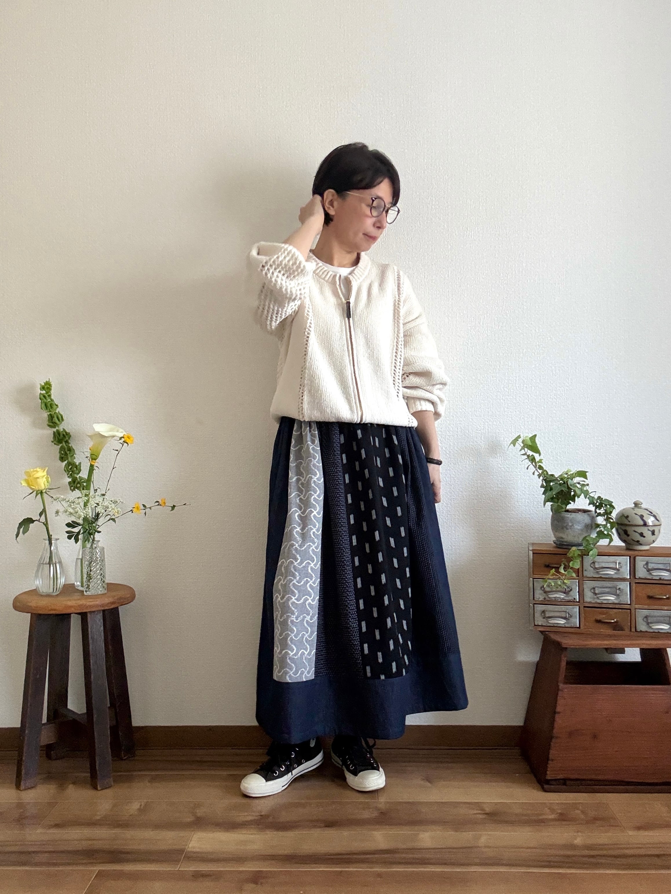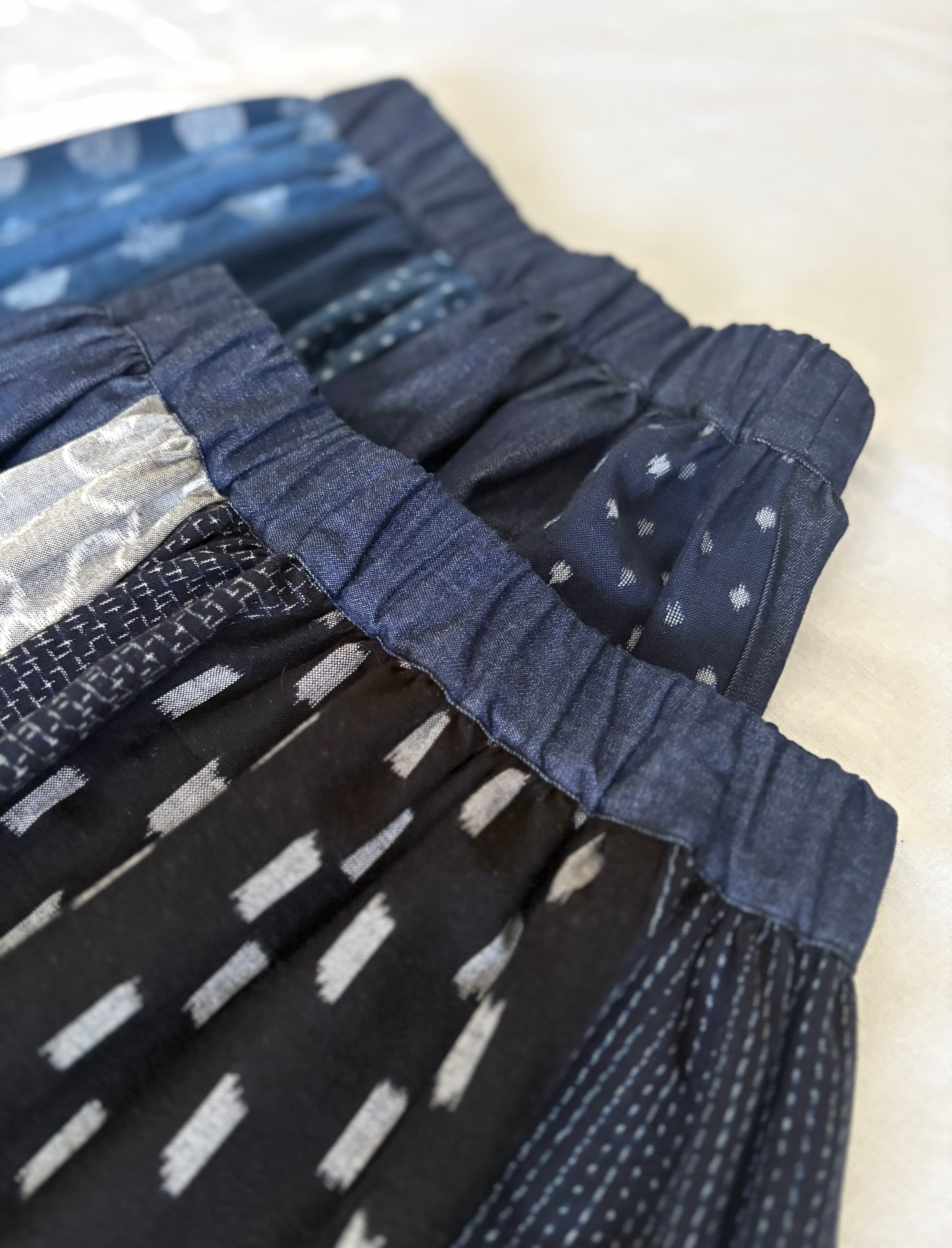 「久留米絣」の新反物と「児島デニム」2つの素材を掛け合わせたスカートは、職人さんたちの技術と情熱が詰まった特別な一枚です。手作業だからこそ生まれる温かみ、そして大量生産では決して味わえない魅力をぜひ感じてください。