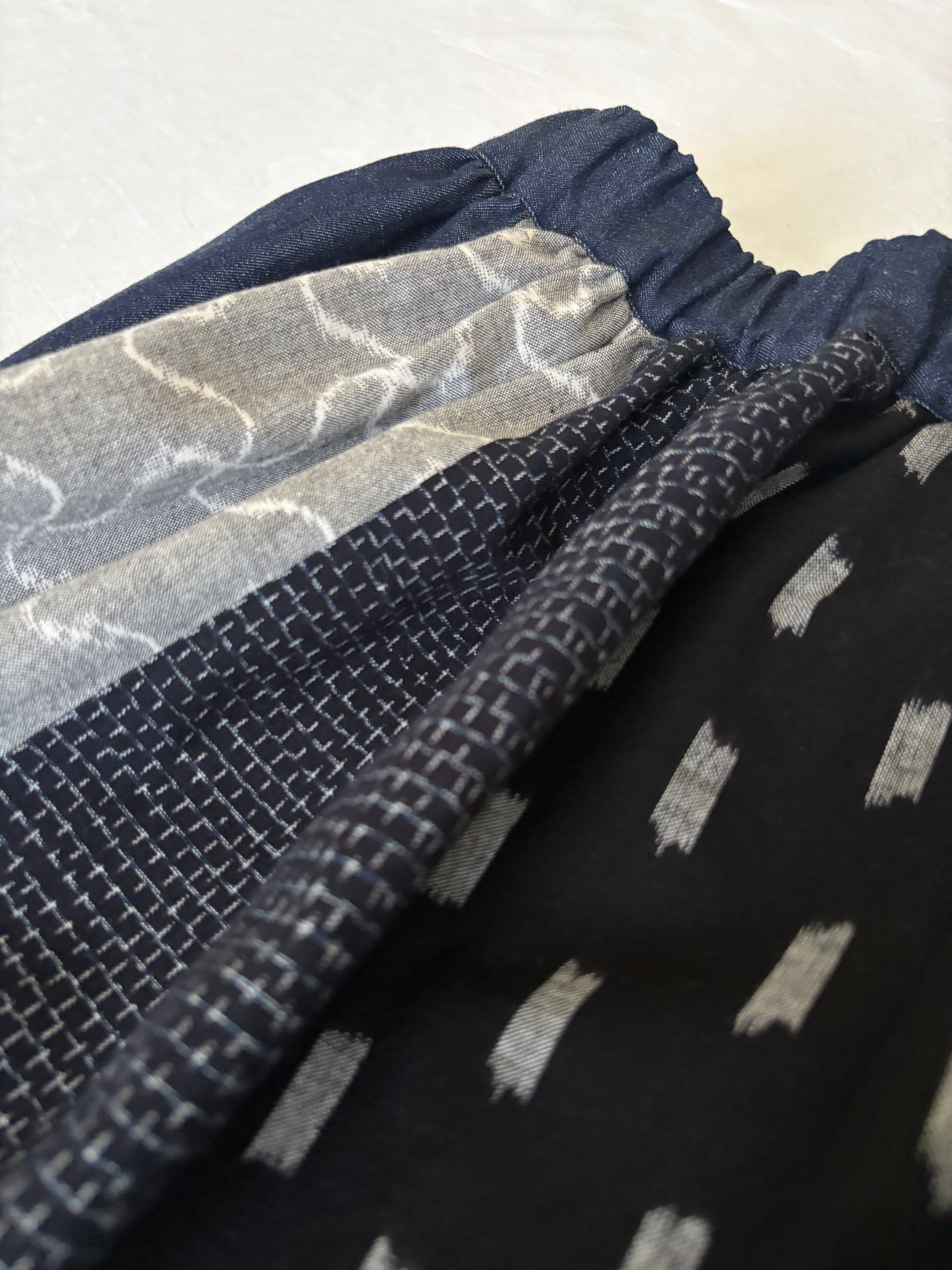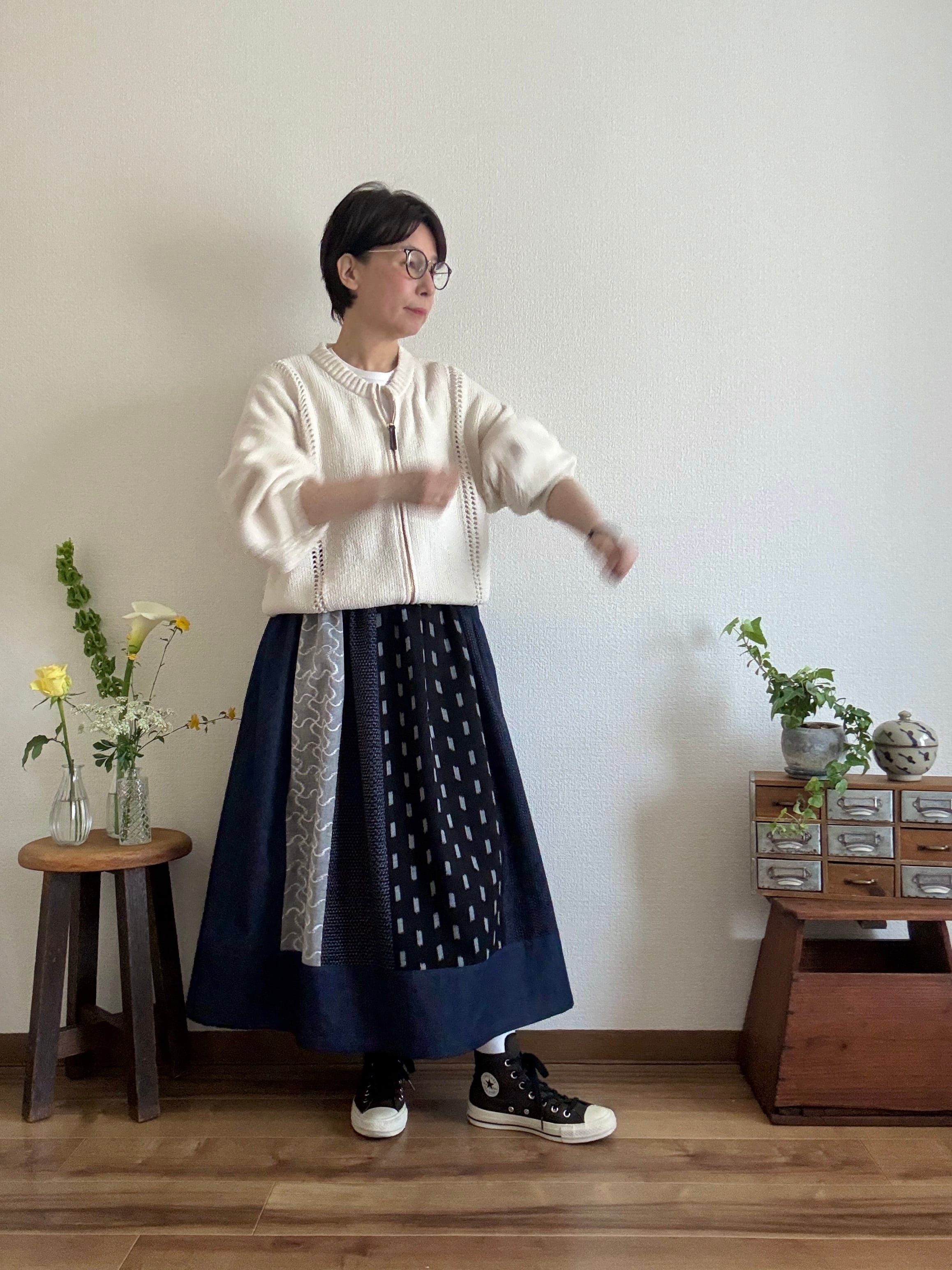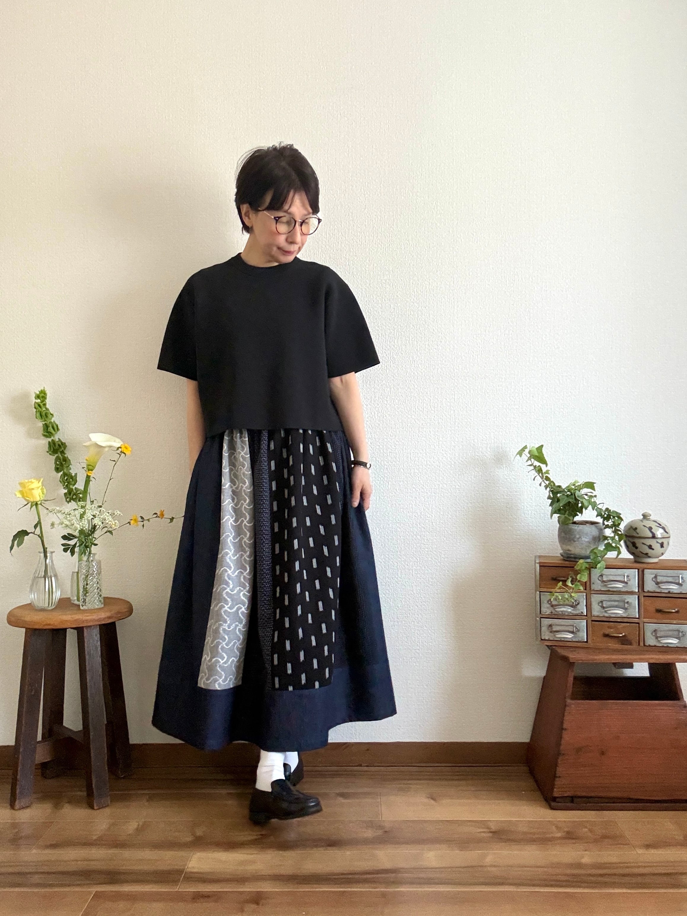「久留米絣」の新反物と「児島デニム」2つの素材を掛け合わせたスカートは、職人さんたちの技術と情熱が詰まった特別な一枚です。手作業だからこそ生まれる温かみ、そして大量生産では決して味わえない魅力をぜひ感じてください。