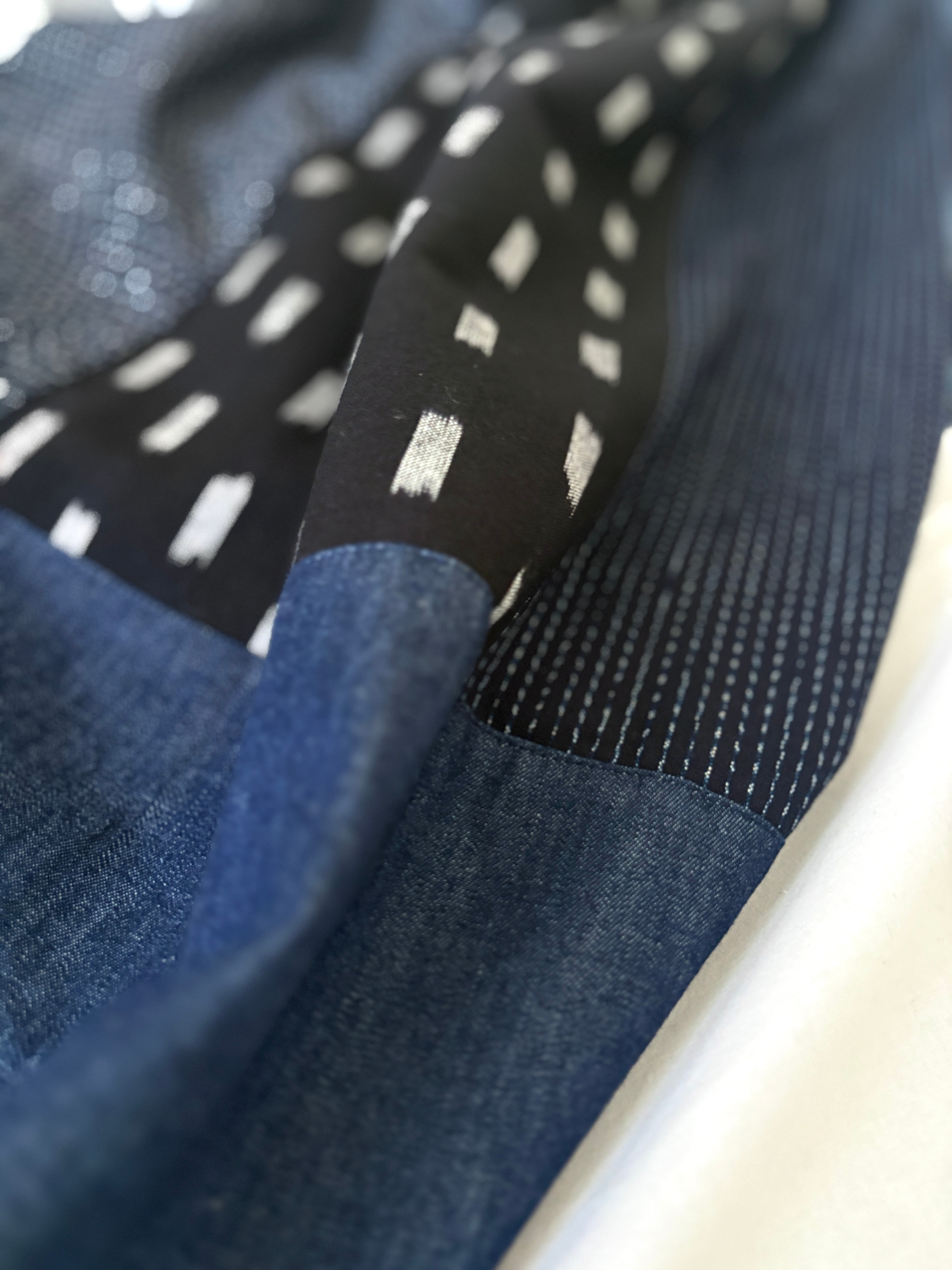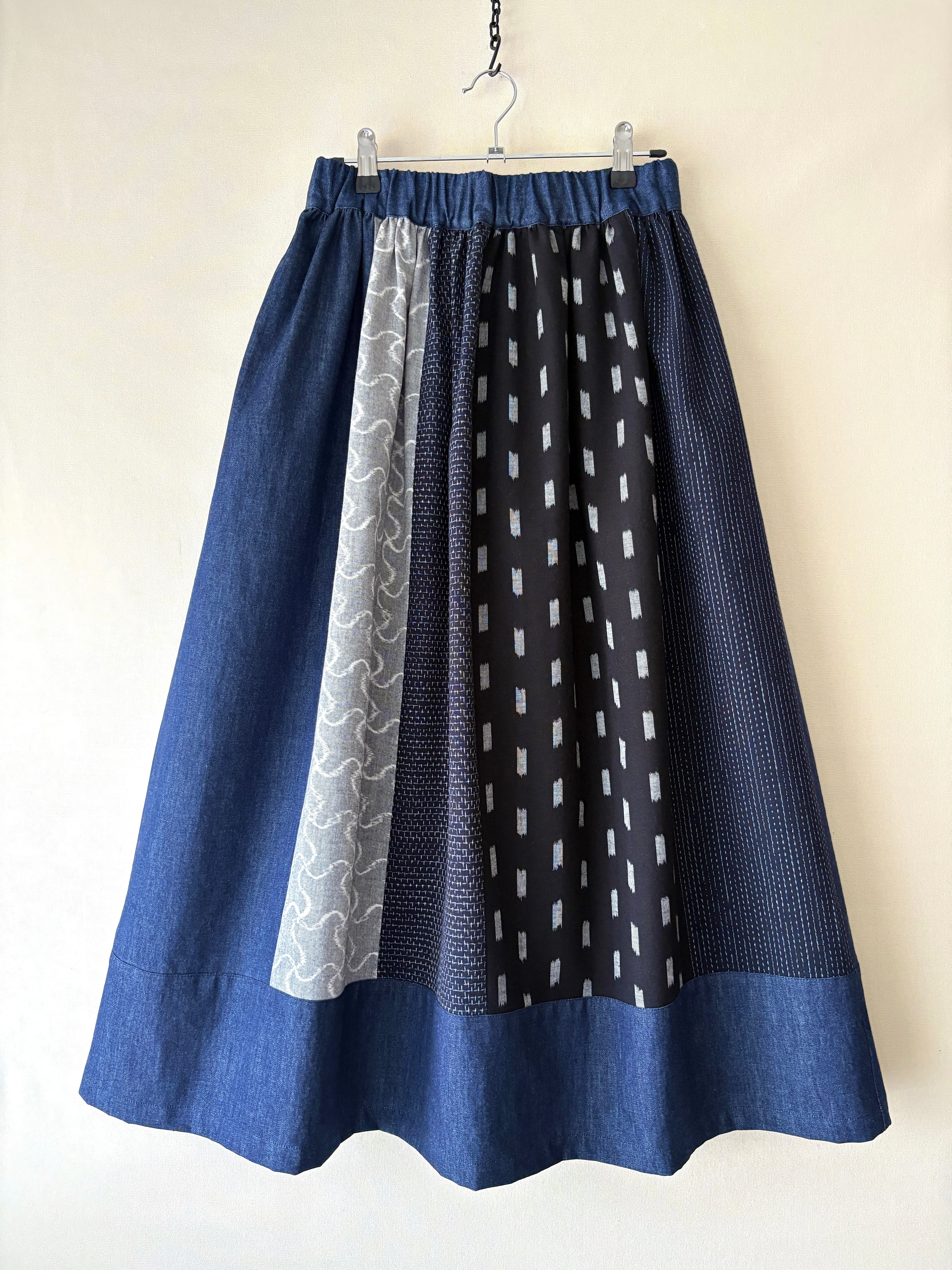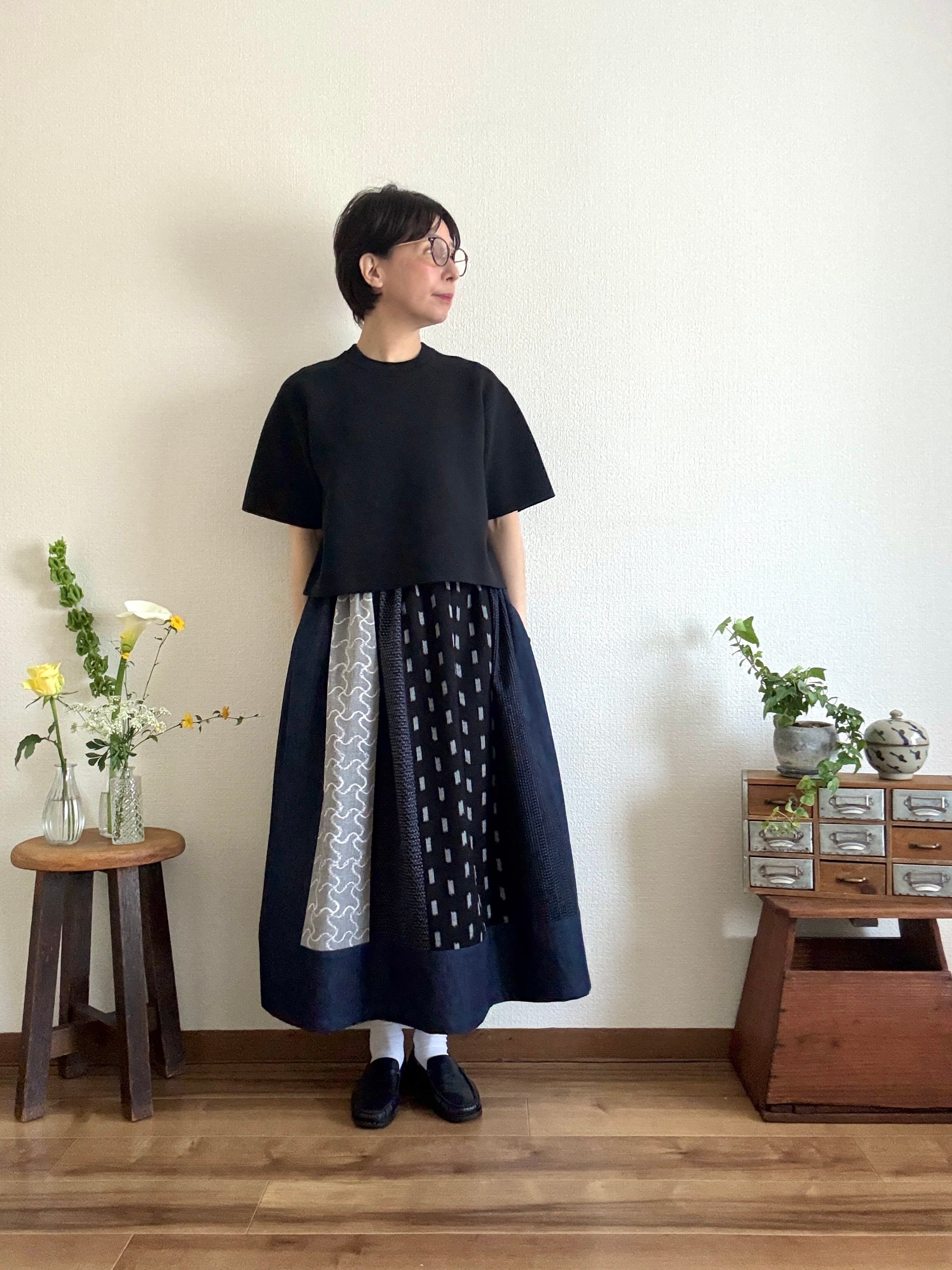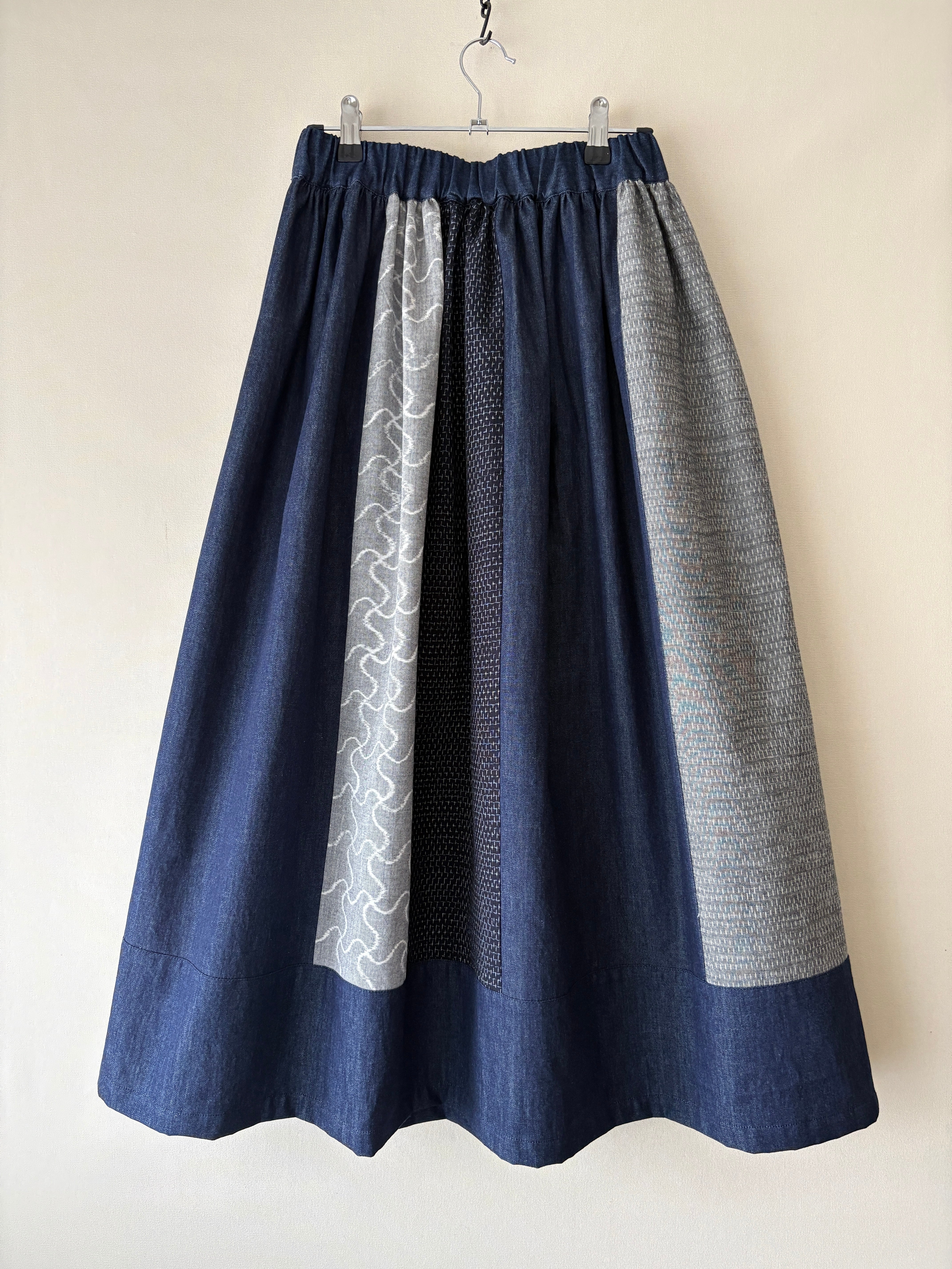 「久留米絣」の新反物と「児島デニム」2つの素材を掛け合わせたスカートは、職人さんたちの技術と情熱が詰まった特別な一枚です。手作業だからこそ生まれる温かみ、そして大量生産では決して味わえない魅力をぜひ感じてください。