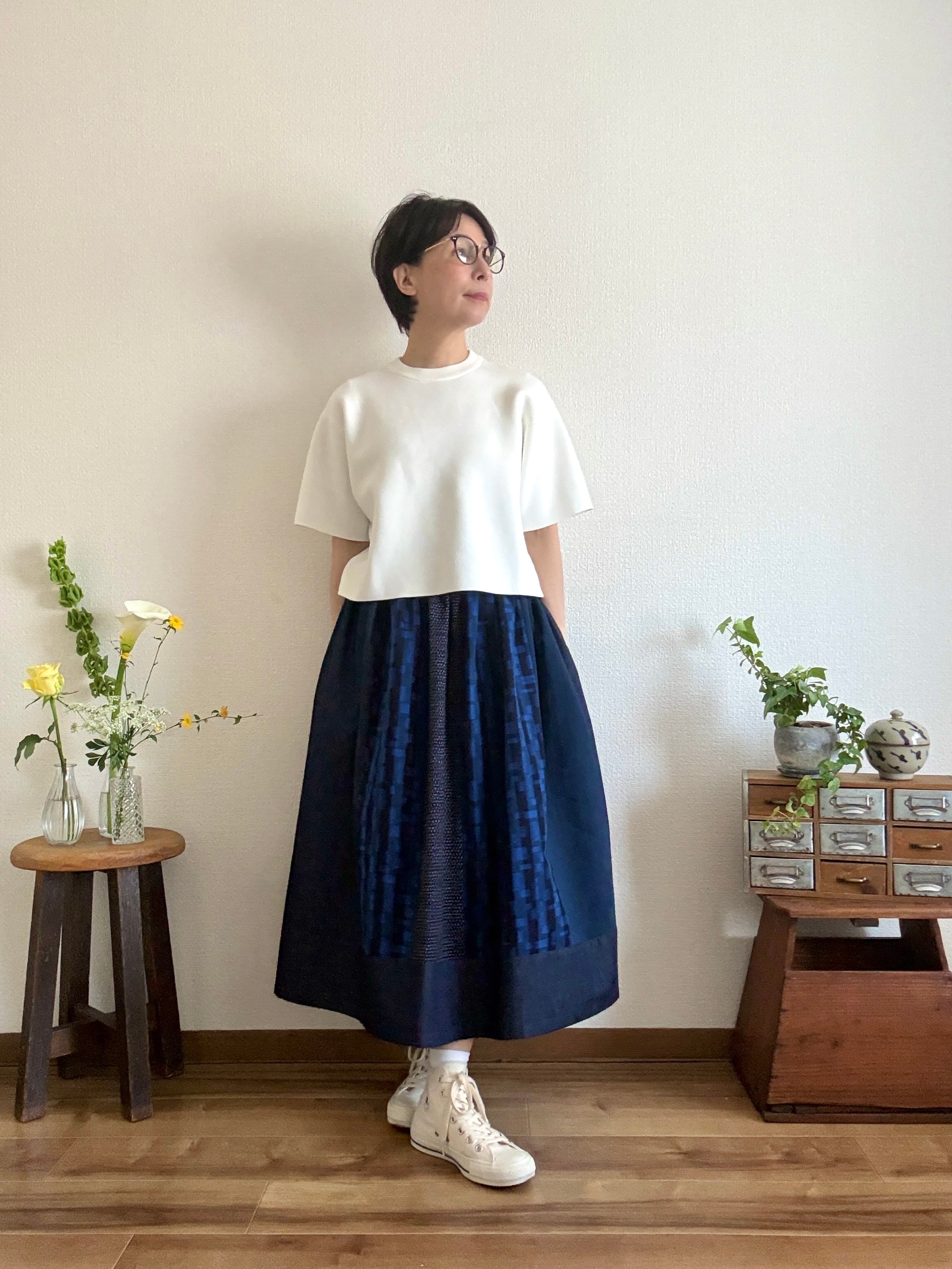 「久留米絣」の新反物と「児島デニム」2つの素材を掛け合わせたスカートは、職人さんたちの技術と情熱が詰まった特別な一枚です。手作業だからこそ生まれる温かみ、そして大量生産では決して味わえない魅力をぜひ感じてください。