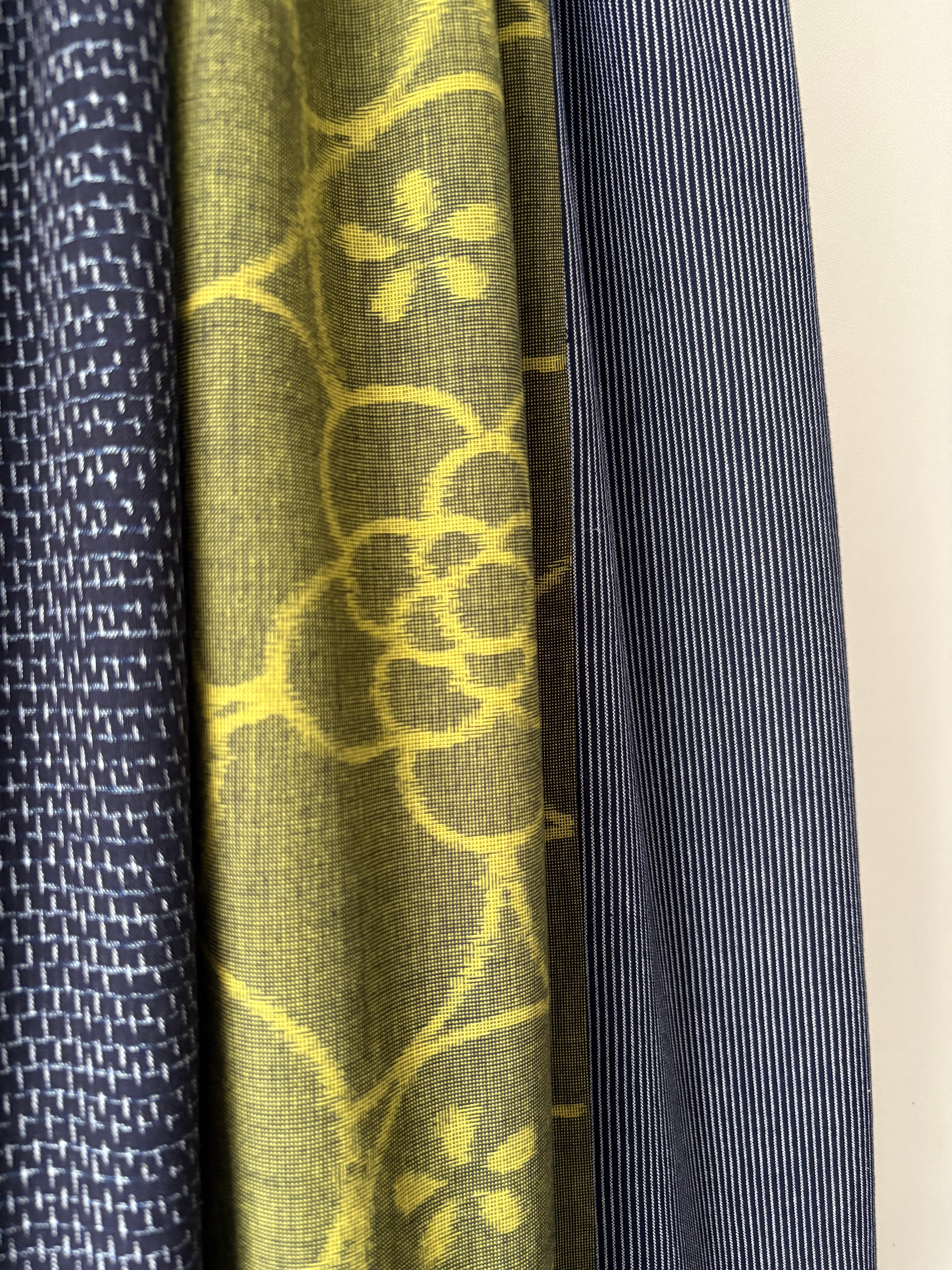 藍と空と初めての黄色系の久留米絣です。大きめで大体な花柄は遠くからでも目を惹きます。