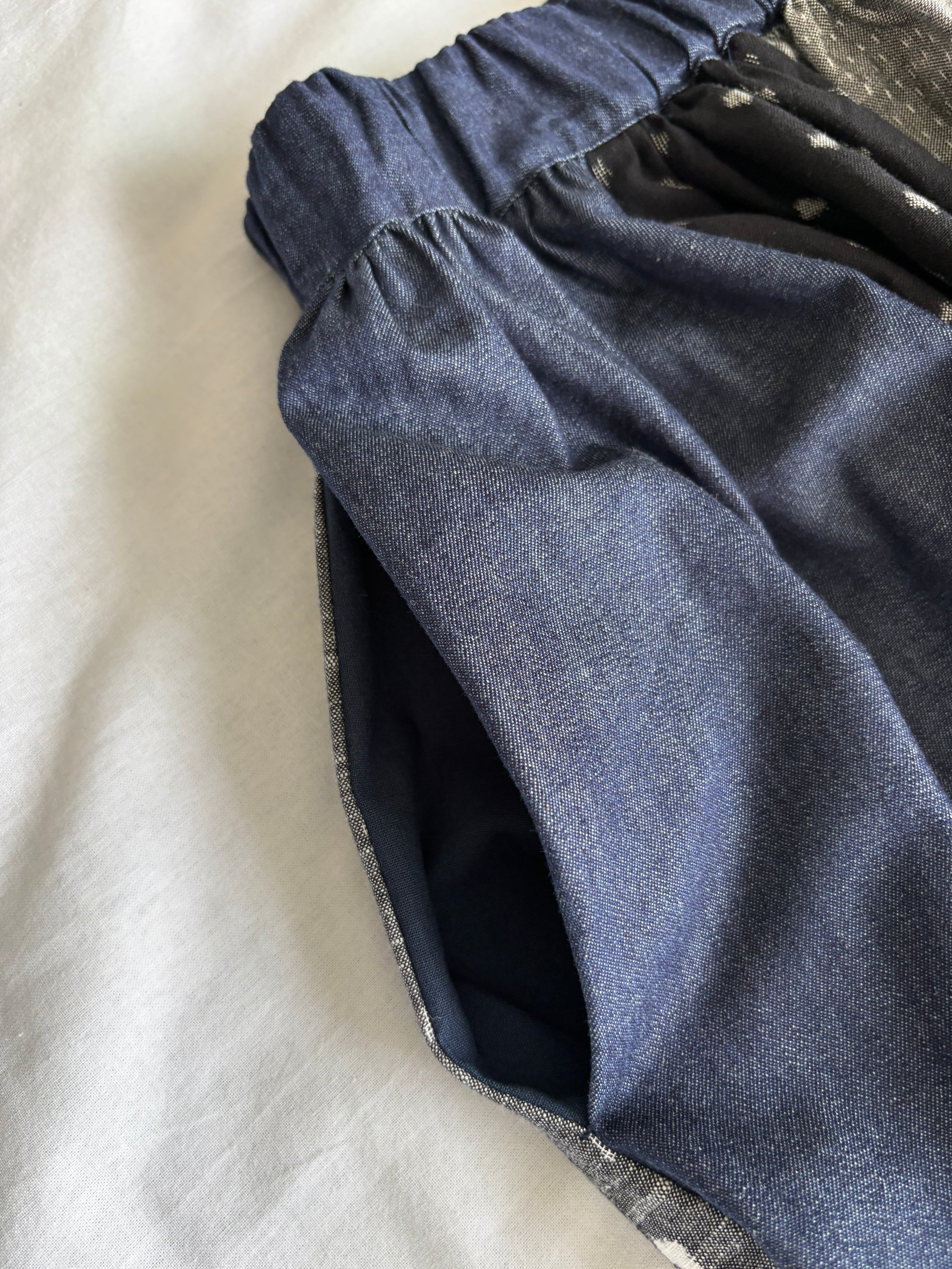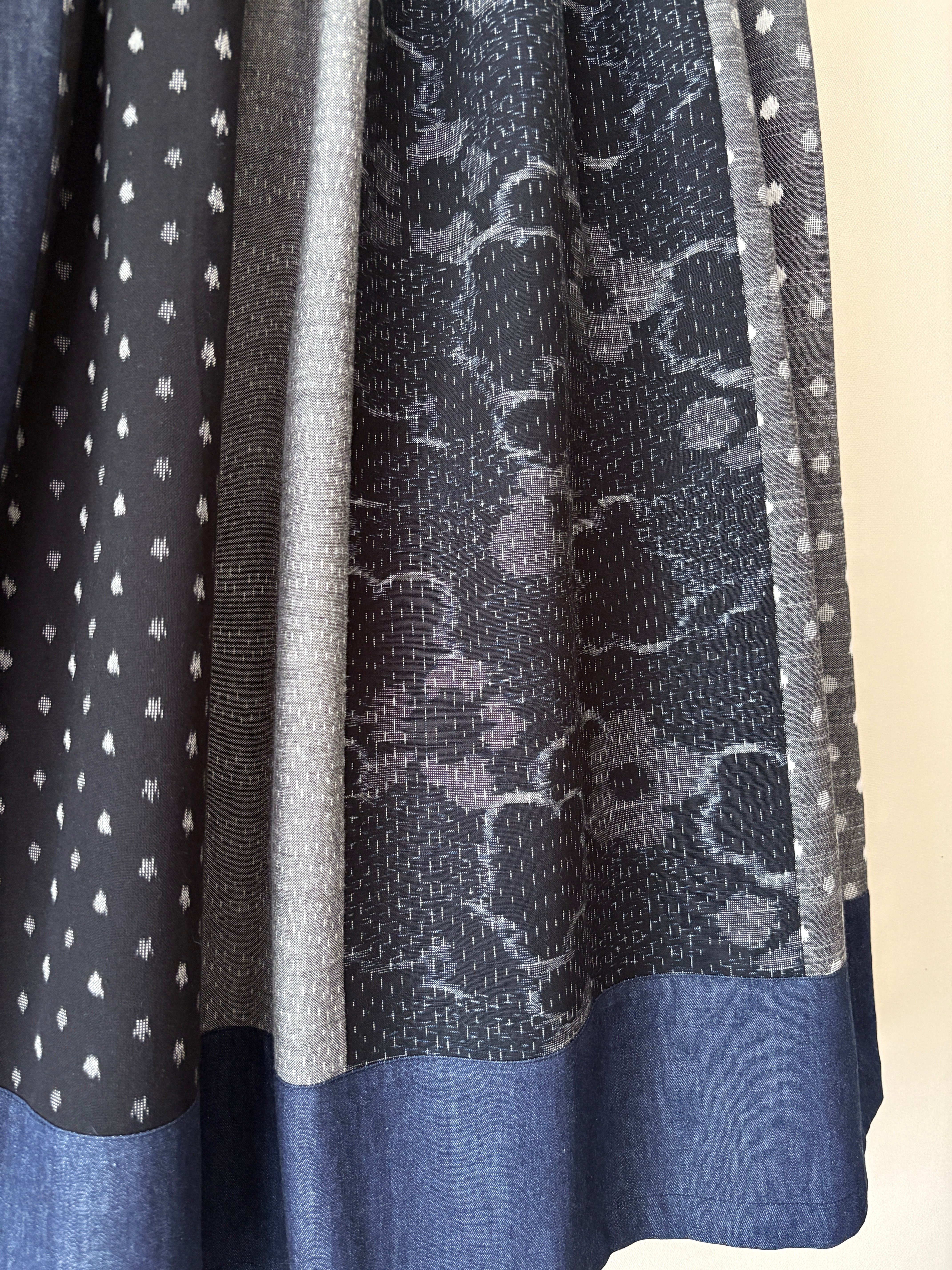「久留米絣」の新反物と「児島デニム」2つの素材を掛け合わせたスカートは、職人さんたちの技術と情熱が詰まった特別な一枚です。手作業だからこそ生まれる温かみ、そして大量生産では決して味わえない魅力をぜひ感じてください。
